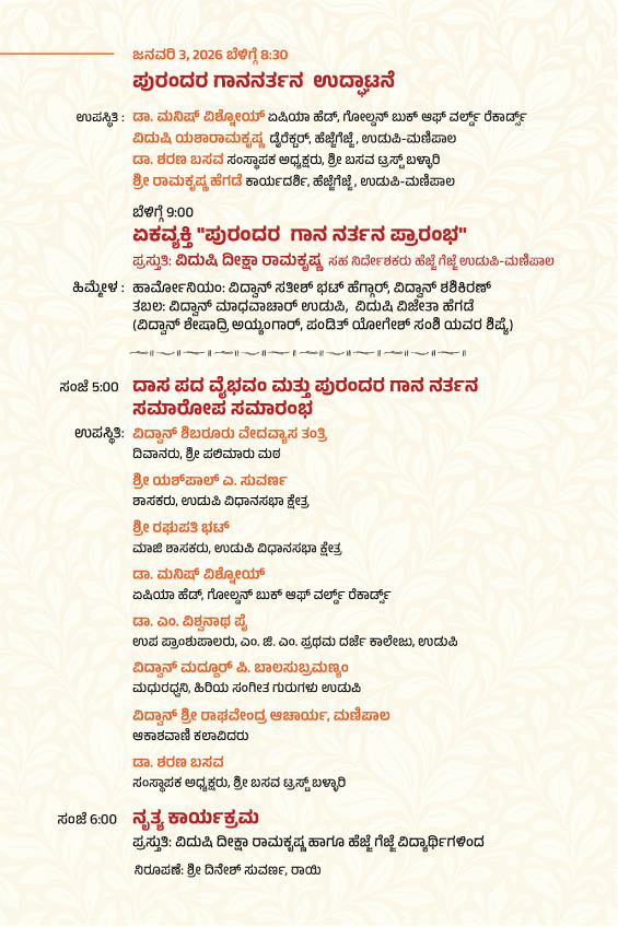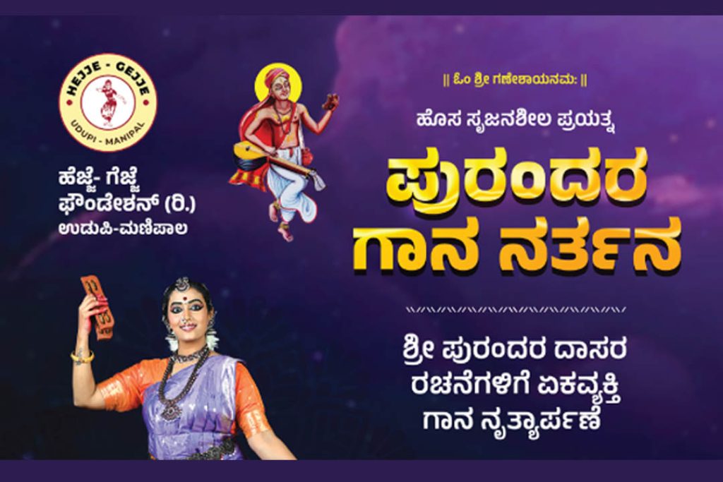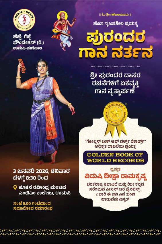 ಮಣಿಪಾಲ : ಹೆಜ್ಜೆ ಗೆಜ್ಜೆ ಫೌಂಡೇಶನ್ (ರಿ.) ಉಡುಪಿ-ಮಣಿಪಾಲ್ ಇದರ ವತಿಯಿಂದ ‘ಪುರಂದರ ಗಾನ ನರ್ತನ’ ಶ್ರೀ ಪುರಂದರ ದಾಸರ ರಚನೆಗಳಿಗೆ ಏಕವ್ಯಕ್ತಿ ಗಾನ ನೃತ್ಯಾರ್ಪಣೆ ಕಾರ್ಯಕ್ರಮವು ದಿನಾಂಕ 03 ಜನವರಿ 2026ರಂದು ಬೆಳಗ್ಗೆ 8-30 ಗಂಟೆಗೆ ಉಡುಪಿಯ ಎಂ.ಜಿ.ಎಂ. ಕಾಲೇಜಿನ ನೂತನ ರವೀಂದ್ರ ಮಂಟಪದಲ್ಲಿ ನಡೆಯಲಿದೆ.