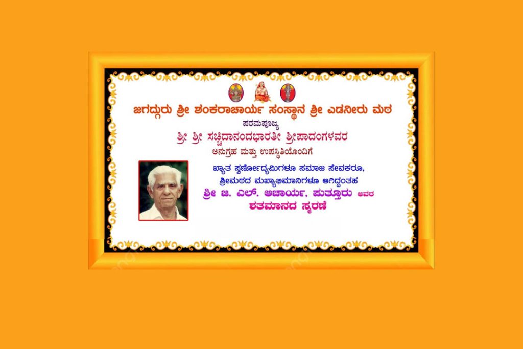 ಕಾಸರಗೋಡು : ಪ್ರಖ್ಯಾತ ಸ್ವರ್ಣ ಉದ್ಯಮಿಗಳೂ, ಸಮಾಜಸೇವಕರೂ ಆಗಿದ್ದ ಶ್ರೀ ಜಿ.ಎಲ್. ಆಚಾರ್ಯ ಪುತ್ತೂರು ಇವರ ಶತಮಾನದ ಸ್ಮರಣೆ ಕಾರ್ಯಕ್ರಮವು ದಿನಾಂಕ 09 ಫೆಬ್ರವರಿ 2025ರಂದು ಶ್ರೀ ಎಡನೀರು ಮಠದಲ್ಲಿ ಶ್ರೀ ಸಚ್ಚಿದಾನಂದ ಭಾರತೀ ಶ್ರೀಪಾದಂಗಳವರ ದಿವ್ಯ ಉಪಸ್ಥಿತಿಯೊಂದಿಗೆ ಜರಗಲಿದೆ.