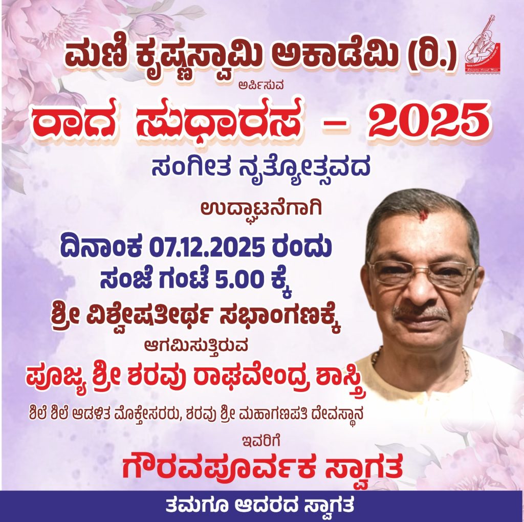 ಸುರತ್ಕಲ್ : ಮಣಿ ಕೃಷ್ಣಸ್ವಾಮಿ ಅಕಾಡೆಮಿ (ರಿ.) ಇದರ ವತಿಯಿಂದ ಕರ್ನಾಟಕ ಸರ್ಕಾರದ ಕನ್ನಡ ಮತ್ತು ಸಂಸ್ಕೃತಿ ಇಲಾಖೆಯ ಸಹಕಾರದೊಂದಿಗೆ ಪ್ರಸ್ತುತ ಪಡಿಸುವ ‘ರಾಗ ಸುಧಾರಸ -2025’ ಸಂಗೀತ ನೃತ್ಯೋತ್ಸವದ ಉದ್ಘಾಟನೆಯು ದಿನಾಂಕ 07 ಡಿಸೆಂಬರ್ 2025ರಂದು ಬೆಳಗ್ಗೆ 5-00 ಗಂಟೆಗೆ ಸುರತ್ಕಲ್ಲಿನ ನಾಗಬನ ರೋಡ್ ಇಲ್ಲಿರುವ ಅನುಪಲ್ಲವಿಯ ಶ್ರೀ ವಿಶ್ವೇಶತೀರ್ಥ ಸಭಾಂಗಣದಲ್ಲಿ ನಡೆಯಲಿದೆ. ಶರವು ಶ್ರೀ ಮಹಾ ಗಣಪತಿ ದೇವಸ್ಥಾನದ ಶಿಲೆ ಶಿಲೆ ಆಡಳಿತ ಮೊಕ್ತೇಸರರಾದ ಪೂಜ್ಯ ಶ್ರೀ ಶರವು ರಾಘವೇಂದ್ರ ಶಾಸ್ತ್ರಿ ಇವರು ಈ ಕಾರ್ಯಕ್ರಮದ ಉದ್ಘಾಟನೆ ಮಾಡಲಿದ್ದಾರೆ.