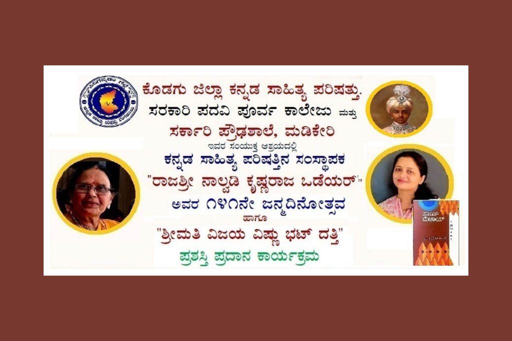 ಮಡಿಕೇರಿ : ಕೊಡಗು ಜಿಲ್ಲಾ ಕನ್ನಡ ಸಾಹಿತ್ಯ ಪರಿಷತ್ತು, ಸರಕಾರಿ ಪದವಿ ಪೂರ್ವ ಕಾಲೇಜು ಮತ್ತು ಸರಕಾರಿ ಪ್ರೌಢಶಾಲೆ ಮಡಿಕೇರಿ ಇವರ ಸಂಯುಕ್ತ ಆಶ್ರಯದಲ್ಲಿ ಕನ್ನಡ ಸಾಹಿತ್ಯ ಪರಿಷತ್ತಿನ ಸಂಸ್ಥಾಪಕ ರಾಜಶ್ರೀ ನಾಲ್ವಡಿ ಕೃಷ್ಣರಾಜ ಒಡೆಯರ್ ಅವರ 141ನೇ ಜನ್ಮದಿನೋತ್ಸವ ಹಾಗೂ ಶ್ರೀಮತಿ ವಿಜಯ ವಿಷ್ಣು ಭಟ್ ದತ್ತಿ ಪ್ರಶಸ್ತಿ ಪ್ರದಾನ ಮತ್ತು ಸಾಧಕರಿಗೆ ಸನ್ಮಾನ ಕಾರ್ಯಕ್ರಮವು ಮಡಿಕೇರಿಯ ಸರಕಾರಿ ಪ್ರೌಢಶಾಲಾ ಸಭಾಂಗಣದಲ್ಲಿ ದಿನಾಂಕ 04 ಜೂನ್ 2025ರಂದು ಬೆಳಿಗ್ಗೆ 11-00 ಗಂಟೆಗೆ ನಡೆಯಲಿದೆ.