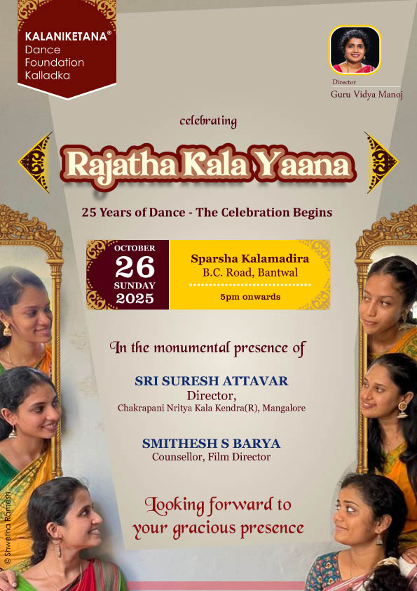 ಬಂಟ್ವಾಳ : ಕಲಾನಿಕೇತನ ಡಾನ್ಸ್ ಫೌಂಡೇಷನ್ ಕಲ್ಲಡ್ಕ ಇವರು ಪ್ರಸ್ತುತ ಪಡಿಸುವ ‘ರಜತ ಕಲಾ ಯಾನ’ ಸಂಭ್ರಮವನ್ನು ದಿನಾಂಕ 26 ಅಕ್ಟೋಬರ್ 2025ರಂದು ಬಂಟ್ವಾಳ ಬಿ.ಸಿ. ರೋಡ್ ಇಲ್ಲಿರುವ ಸ್ಪರ್ಶ ಕಲಾಮಂದಿರದಲ್ಲಿ ಹಮ್ಮಿಕೊಳ್ಳಲಾಗಿದೆ. ಮಂಗಳೂರಿನ ಚಕ್ರಪಾಣಿ ನೃತ್ಯ ಕಲಾ ಕೇಂದ್ರದ ಸುರೇಶ್ ಅತ್ತಾವರ ಮತ್ತು ಸ್ಮಿಥೇಶ್ ಎಸ್. ಬಾರ್ಯ ಇವರು ಭಾಗವಹಿಸಲಿದ್ದಾರೆ.