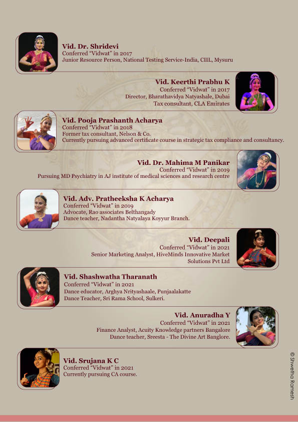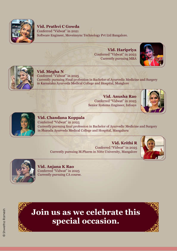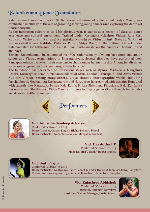 ವಿದುಷಿ ಅಮೃತ ಸಂದೀಪ್ ಆಚಾರ್ಯ, ವಿದುಷಿ ಹರ್ಷಿತಾ ಟಿ.ಪಿ., ವಿದುಷಿ ಪ್ರಜ್ಞಾ, ವಿದುಷಿ ರಾಜಶ್ರೀ ಅಭಿಷೇಕ್, ವಿದುಷಿ ಶ್ರೀದೇವಿ, ವಿದುಷಿ ಕೀರ್ತಿ ಪ್ರಭು ಕೆ., ವಿದುಷಿ ಪೂಜಾ ಪ್ರಶಾಂತ್ ಆಚಾರ್ಯ, ವಿದುಷಿ ಮಹಿಮಾ ಎಂ. ಪಣಿಕರ್, ವಿದುಷಿ ಪ್ರತೀಕ್ಷಾ ಕೆ. ಆಚಾರ್ಯ, ವಿದುಷಿ ದೀಪಾಲಿ, ವಿದುಷಿ ಶಾಶ್ವತ ತಾರನಾಥ್, ವಿದುಷಿ ಅನುರಾಧ ವೈ., ವಿದುಷಿ ಸೃಜನಾ ಕೆ.ಸಿ., ವಿದುಷಿ ಪ್ರಥ್ವಿ ಸಿ. ಗೌಡ, ವಿದುಷಿ ಹರಿಪ್ರಿಯಾ, ವಿದುಷಿ ಮೇಘಾ ಎನ್., ವಿದುಷಿ ಅನುಷಾ ರಾವ್, ವಿದುಷಿ ಚಂದನ ಕೊಪ್ಪಳ, ವಿದುಷಿ ಕೃತಿ ಆರ್., ವಿದುಷಿ ಅಂಜನಾ ಕೆ. ರಾವ್ ಇವರುಗಳು ನೃತ್ಯ ಪ್ರದರ್ಶನ ನೀಡಲಿದ್ದು, ನಟ್ಟುವಾಂಗದಲ್ಲಿ ವಿದುಷಿ ವಿದ್ಯಾ ಮನೋಜ್, ಹಾಡುಗಾರಿಕೆಯಲ್ಲಿ ವಿನೀತ್ ಪುರುವಂಕರ, ಗಿತೇಶ್ ಗೋಪಾಲಕೃಷ್ಣನ್ ನೀಲೇಶ್ವರಂ ಇವರು ಮೃದಂಗಂನಲ್ಲಿ ಹಾಗೂ ಎ.ಎಸ್. ಹರಿಪ್ರಸಾದ್ ನೀಲೇಶ್ವರಂ ಇವರು ಕೊಳಲಿನಲ್ಲಿ ಸಾಥ್ ನೀಡಲಿದ್ದಾರೆ.