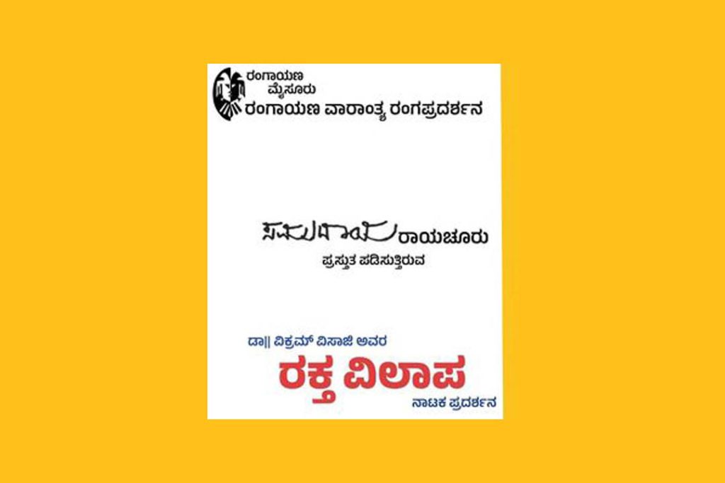 ಮೈಸೂರು : ರಂಗಾಯಣ ಮೈಸೂರು ಇದರ ವತಿಯಿಂದ ರಂಗಾಯಣ ವಾರಾಂತ್ಯ ರಂಗಪ್ರದರ್ಶನದ ಪ್ರಯುಕ್ತ ಸಮುದಾಯ ರಾಯಚೂರು ಪ್ರಸ್ತುತ ಪಡಿಸುವ ಡಾ. ವಿಕ್ರಮ್ ವಿಸಾಜಿಯವರ ‘ರಕ್ತ ವಿಲಾಪ’ ನಾಟಕ ಪ್ರದರ್ಶನವು ದಿನಾಂಕ 29 ಸೆಪ್ಟೆಂಬರ್ 2024ರಂದು ಸಂಜೆ 6-00 ಗಂಟೆಗೆ ಮೈಸೂರು ರಂಗಾಯಣದ ಭೂಮಿಗೀತದಲ್ಲಿ ನಡೆಯಲಿದೆ.