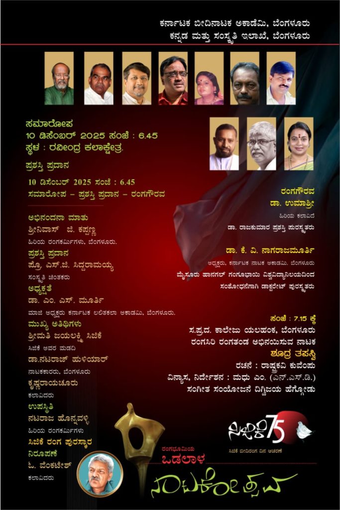 ಬೆಂಗಳೂರು : ಕರ್ನಾಟಕ ಬೀದಿನಾಟಕ ಅಕಾಡೆಮಿ ಬೆಂಗಳೂರು ಮತ್ತು ಕನ್ನಡ ಮತ್ತು ಸಂಸ್ಕೃತಿ ಇಲಾಖೆ ಬೆಂಗಳೂರು ಇದರ ವತಿಯಿಂದ ಸಿಜಿಕೆ 75 ಸಿಜಿಕೆ ಬೀದಿರಂಗ ದಿನ ಆಚರಣೆ ಪ್ರಯುಕ್ತ ‘ರಂಗಭೂಮಿಯ ಒಡಲಾಳ ನಾಟಕೋತ್ಸವ’ವನ್ನು ದಿನಾಂಕ 08ರಿಂದ 10 ಡಿಸೆಂಬರ್ 2025ರವರೆಗೆ ಬೆಂಗಳೂರಿನ ರವೀಂದ್ರ ಕಲಾಕ್ಷೇತ್ರ ಮತ್ತು ಮಹಿಳಾ ವಿಶ್ರಾಂತಿ ಕೊಠಡಿಯಲ್ಲಿ ಹಮ್ಮಿಕೊಳ್ಳಲಾಗಿದೆ.