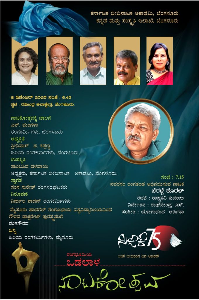 ದಿನಾಂಕ 08 ಡಿಸೆಂಬರ್ 2025ರಂದು ಸಂಜೆ ಗಂಟೆ 6-45ಕ್ಕೆ ರಂಗಕರ್ಮಿ ಎನ್. ಮಂಗಳಾ ಇವರು ನಾಟಕೋತ್ಸವಕ್ಕೆ ಚಾಲನೆ ನೀಡಲಿದ್ದು, ಹಿರಿಯ ರಂಗಕರ್ಮಿ ಶ್ರೀನಿವಾಸ್ ಜಿ. ಕಪ್ಪಣ್ಣ ಇವರು ಅಧ್ಯಕ್ಷತೆ ವಹಿಸಲಿದ್ದಾರೆ. ಹಿರಿಯ ರಂಗಕರ್ಮಿ ಜನ್ನಿ ಇವರಿಗೆ ರಂಗ ಗೌರವ ನೀಡಲಾಗುವುದು. ಸಭಾ ಕಾರ್ಯಕ್ರಮದ ಬಳಿಕ ನವರಸಂ ರಂಗತಂಡ ಅಭಿನಯಿಸುವ ‘ಬೆರಳ್ಗೆ ಕೊರಳ್’ ನಾಟಕವು ರಾಘವೇಂದ್ರ ಎಸ್. ಇವರ ನಿರ್ದೇಶನದಲ್ಲಿ ಪ್ರಸ್ತುತಗೊಳ್ಳಲಿದೆ.