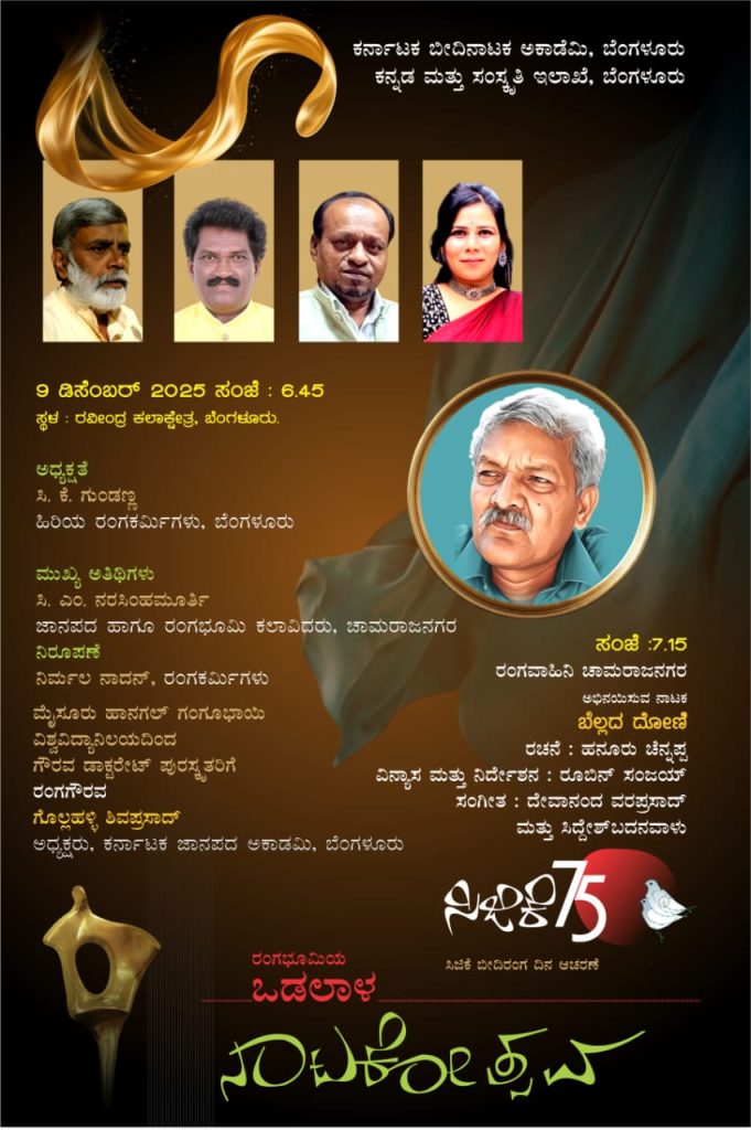 ದಿನಾಂಕ 09 ಡಿಸೆಂಬರ್ 2025ರಂದು ಸಂಜೆ ಗಂಟೆ 7-15ಕ್ಕೆ ನಡೆಯುವ ಸಭಾ ಕಾರ್ಯಕ್ರಮದ ಅಧ್ಯಕ್ಷತೆಯನ್ನು ಹಿರಿಯ ರಂಗಕರ್ಮಿ ಸಿ.ಕೆ. ಗುಂಡಣ್ಣ ಇವರು ವಹಿಸಲಿದ್ದು, ಕರ್ಣಾಟಕ ಜಾನಪದ ಅಕಾಡೆಮಿ ಅಧ್ಯಕ್ಷರಾದ ಗೊಲ್ಲಹಳ್ಳಿ ಶಿವಪ್ರಸಾದ್ ಇವರಿಗೆ ರಂಗ ಗೌರವ ನೀಡಲಾಗುವುದು. ಬಳಿಕ ರಂಗವಾಹಿನಿ ಚಾಮರಾಜನಗರ ಅಭಿನಯಿಸುವ ‘ಬೆಲ್ಲದ ದೋಣಿ’ ನಾಟಕವು ರೂಬಿನ್ ಸಂಜಯ್ ಇವರ ವಿನ್ಯಾಸ ಮತ್ತು ನಿರ್ದೇಶನದಲ್ಲಿ ಪ್ರಸ್ತುತಗೊಳ್ಳಲಿದೆ.