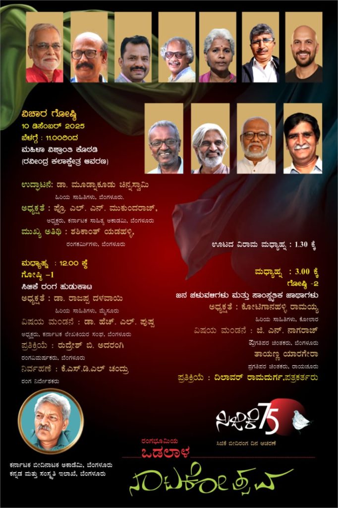 ಬೆಂಗಳೂರು : ಕರ್ನಾಟಕ ಬೀದಿನಾಟಕ ಅಕಾಡೆಮಿ ಬೆಂಗಳೂರು ಮತ್ತು ಕನ್ನಡ ಮತ್ತು ಸಂಸ್ಕೃತಿ ಇಲಾಖೆ ಬೆಂಗಳೂರು ಇದರ ವತಿಯಿಂದ ಸಿಜಿಕೆ 75 ಸಿಜಿಕೆ ಬೀದಿರಂಗ ದಿನ ಆಚರಣೆ ಪ್ರಯುಕ್ತ ‘ರಂಗಭೂಮಿಯ ಒಡಲಾಳ ನಾಟಕೋತ್ಸವ’ವನ್ನು ದಿನಾಂಕ 08ರಿಂದ 10 ಡಿಸೆಂಬರ್ 2025ರವರೆಗೆ ಬೆಂಗಳೂರಿನ ರವೀಂದ್ರ ಕಲಾಕ್ಷೇತ್ರ ಮತ್ತು ಮಹಿಳಾ ವಿಶ್ರಾಂತಿ ಕೊಠಡಿಯಲ್ಲಿ ಹಮ್ಮಿಕೊಳ್ಳಲಾಗಿದೆ.