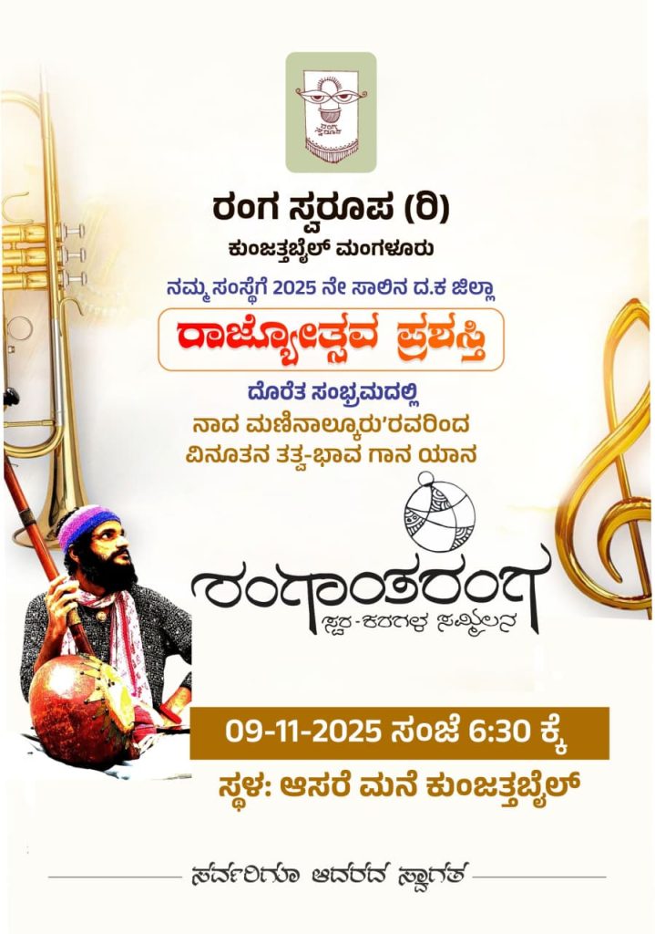 ಮಂಗಳೂರು : ರಂಗ ಸ್ವರೂಪ (ರಿ.) ಕುಂಜತ್ತಬೈಲ್ ಇದರ ವತಿಯಿಂದ ರಾಜ್ಯೋತ್ಸವ ಪ್ರಶಸ್ತಿ ದೊರೆತ ಸಂಭ್ರಮದಲ್ಲಿ ನಾದ ಮಣಿನಾಲ್ಕೂರುರವರಿಂದ ವಿನೂತನ ತತ್ವ-ಭಾವ ಗಾನ ಯಾನ ‘ರಂಗಾಂತರಂಗ’ ಸ್ವರ ಕರಗಳ ಸಮ್ಮಿಲನ ಕಾರ್ಯಕ್ರಮವನ್ನು ದಿನಾಂಕ 09 ನವೆಂಬರ್ 2025ರಂದು ಕುಂಜತ್ತಬೈಲ್ ಇಲ್ಲಿರುವ ‘ಆಸರೆ’ ಮನೆಯಲ್ಲಿ ಹಮ್ಮಿಕೊಳ್ಳಲಾಗಿದೆ.