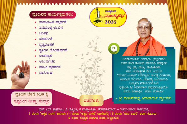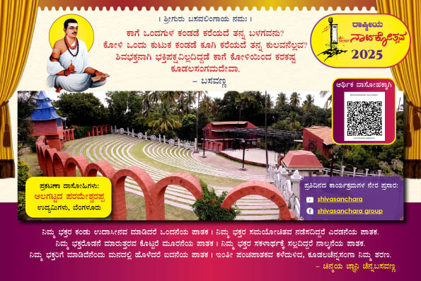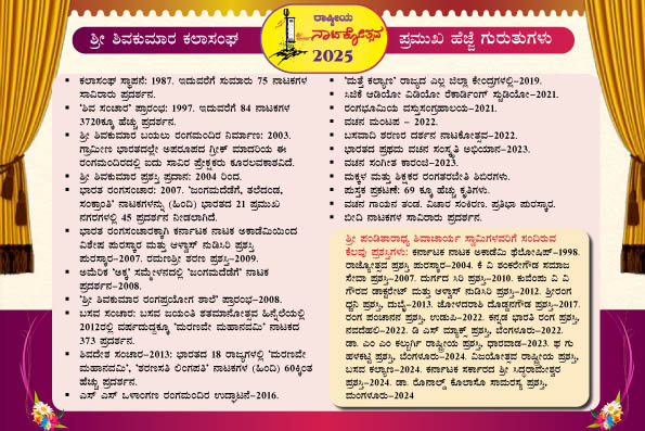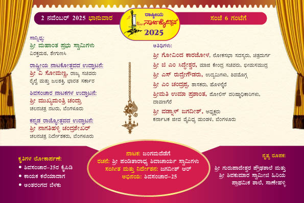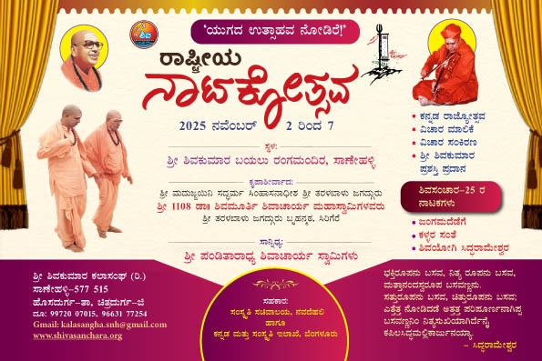 ದಿನಾಂಕ 02 ನವೆಂಬರ್ 2025ರಂದು ಸಂಜೆ 6-00 ಗಂಟೆಗೆ ರಾಜ್ಯ ಸಚಿವರಾದ ವಿ. ಸೋಮಣ್ಣ ಇವರಿಂದ ರಾಷ್ಟ್ರೀಯ ನಾಟಕೋತ್ಸವ, ಚಲನಚಿತ್ರ ನಟ ಮುಖ್ಯಮಂತ್ರಿ ಚಂದ್ರು ಇವರಿಂದ ಶಿವಸಂಚಾರ ನಾಟಕ ಮತ್ತು ಚಲನಚಿತ್ರ ನಿರ್ದೇಶಕರಾದ ನಾಗತಿಹಳ್ಳಿ ಚಂದ್ರಶೇಖರ್ ಇವರಿಂದ ಕನ್ನಡ ರಾಜ್ಯೋತ್ಸವದ ಉದ್ಘಾಟನೆ ನಡೆಯಲಿದೆ. ‘ಶಿವಸಂಚಾರ -25ರ ಕೈಪಿಡಿ’, ‘ಕಾಯಕ ಕಲೆಯಾದಾಗ’, ‘ಅಂತರಂಗದ ಬೆಳಕು’ ಕೃತಿಗಳ ಲೋಕಾರ್ಪಣೆ, ಶ್ರೀ ಗುರುಪಾದೇಶ್ವರ ಪ್ರೌಢಶಾಲೆ ಮತ್ತು ಶ್ರೀ ಶಿವಕುಮಾರ ಸ್ವಾಮೀಜಿ ಹಿರಿಯ ಪ್ರಾಥಮಿಕ ಶಾಲೆ ವಿದ್ಯಾರ್ಥಿಗಳಿಂದ ನೃತ್ಯ ರೂಪಕ ಮತ್ತು ಜಗದೀಶ್ ಆರ್. ಇವರ ಸಂಗೀತ ಮತ್ತು ನಿರ್ದೇಶನದಲ್ಲಿ ‘ಜಂಗಮದೆಡೆಗೆ’ ನಾಟಕ ಪ್ರದರ್ಶನ ನಡೆಯಲಿದೆ.