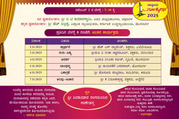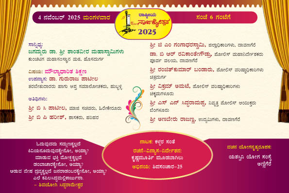 ದಿನಾಂಕ 04 ನವೆಂಬರ್ 2025ರಂದು ಸಂಜೆ 6-00 ಗಂಟೆಗೆ ತರಬೇತುದಾರರಾದ ಡಾ. ಗುರುರಾಜ ಪಾಟೀಲ ಇವರಿಂದ ‘ಮೌಲ್ಯಾಧಾರಿತ ಶಿಕ್ಷಣ’ ಎಂಬ ವಿಷಯದ ಬಗ್ಗೆ ಉಪನ್ಯಾಸ, ಯಶಸ್ವಿನಿ ಯೋಗ ಸಂಸ್ಥೆಯವರಿಂದ ವಚನ ಯೋಗ ನೃತ್ಯ ರೂಪಕ, ಕೃಷ್ಣಮೂರ್ತಿ ಮೂಡಬಾಗಿಲು ಇವರ ರಚನೆ, ವಿನ್ಯಾಸ ಮತ್ತು ನಿರ್ದೇಶನದಲ್ಲಿ ‘ಕಳ್ಳರ ಸಂತೆ’ ನಾಟಕ ಪ್ರದರ್ಶನ ನಡೆಯಲಿದೆ.