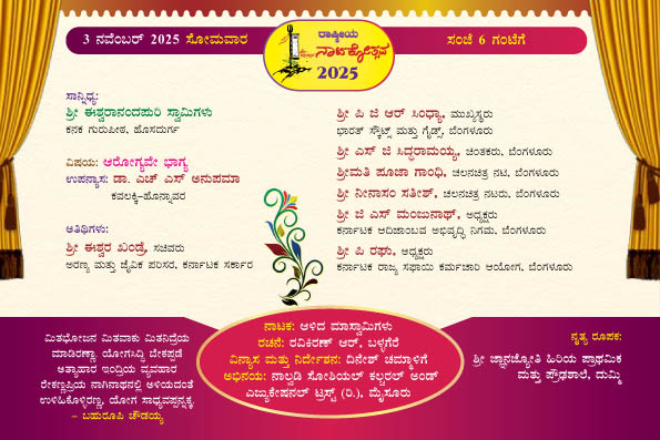 ದಿನಾಂಕ 03 ನವೆಂಬರ್ 2025ರಂದು ಸಂಜೆ 6-00 ಗಂಟೆಗೆ ಹೊನ್ನಾವರದ ಡಾ. ಎಚ್.ಎಸ್. ಅನುಪಮಾ ಇವರಿಂದ ‘ಆರೋಗ್ಯವೇ ಭಾಗ್ಯ’ ಎಂಬ ವಿಷಯದ ಬಗ್ಗೆ ಉಪನ್ಯಾಸ, ಶ್ರೀ ಜ್ಞಾನಜ್ಯೋತಿ ಹಿರಿಯ ಪ್ರಾಥಮಿಕ ಮತ್ತು ಪ್ರೌಢ ಶಾಲೆಯ ವಿದ್ಯಾರ್ಥಿಗಳಿಂದ ನೃತ್ಯ ರೂಪಕ, ದಿನೇಶ್ ಚಮ್ಮಾಳಿಗೆ ಇವರ ವಿನ್ಯಾಸ ಮತ್ತು ನಿರ್ದೇಶನದಲ್ಲಿ ಮೈಸೂರಿನ ನಾಲ್ವಡಿ ಸೋಶಿಯಲ್ ಕಲ್ಚರಲ್ ಅಂಡ್ ಎಜ್ಯುಕೇಷನಲ್ ಟ್ರಸ್ಟ್ ಇವರಿಂದ ‘ಆಳಿದ ಮಾಸ್ವಾಮಿಗಳು’ ನಾಟಕ ಪ್ರಸ್ತುತಗೊಳ್ಳಲಿದೆ.