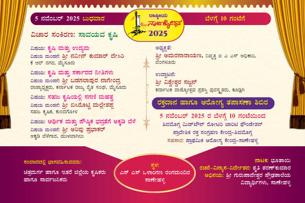 ದಿನಾಂಕ 05 ನವೆಂಬರ್ 2025ರಂದು ಬೆಳಗ್ಗೆ 10-00 ಗಂಟೆಗೆ ಸಾಣೇಹಳ್ಳಿ ಎಸ್.ಎಸ್. ಒಳಾಂಗಣ ರಂಗ ಮಂದಿರದಲ್ಲಿ ‘ಸಾವಯವ ಕೃಷಿ’ ವಿಚಾರ ಸಂಕಿರಣದಲ್ಲಿ ನವೀನ್ ಕುಮಾರ್ ದೇಸಿರಿ ಇವರು ‘ಕೃಷಿ ಮತ್ತು ಉದ್ಯಮ’, ಬಡಗಲಾಪುರ ನಾಗೇಂದ್ರ ಇವರು ‘ಕೃಷಿ ಮತ್ತು ಸರ್ಕಾರದ ನೀತಿಗಳು’, ಬಿಸಿರೊಟ್ಟಿ ಮಲ್ಲೇಶಪ್ಪ ಇವರು ‘ಸಹಜ ಕೃಷಿಯಲ್ಲಿ ಸಗಣಿ ಮಹತ್ವ’ ಮತ್ತು ಅರಿವು ಪ್ರಭಾಕರ್ ಇವರು ‘ಆರ್ಥಿಕ ಮತ್ತು ಪೌಷ್ಠಿಕ ಭದ್ರತೆಗೆ ಅಕ್ಕಡಿ ಬೆಳೆ’ ಎಂಬ ವಿಷಯದ ಬಗ್ಗೆ ವಿಷಯ ಮಂಡನೆ ಮಾಡಲಿದ್ದಾರೆ. ಚಿತ್ರದುರ್ಗ, ಇತರೆ ಜಿಲ್ಲೆಯ ಕೃಷಿಕರು ಹಾಗೂ ಸಾರ್ವಜನಿಕರಿಂದ ಸಂವಾದ, ಶೃತಿ ಶರಣ್ ಕುಮಾರ ಇವರ ರಚನೆ ವಿನ್ಯಾಸ ಮತ್ತು ನಿರ್ದೇಶನದಲ್ಲಿ ಶ್ರೀ ಗುರುಪಾದೇಶ್ವರ ಪ್ರೌಢ ಶಾಲೆಯ ವಿದ್ಯಾರ್ಥಿಗಳಿಂದ ‘ಭೂತಾಯಿ’ ನಾಟಕ ಪ್ರದರ್ಶನ ನಡೆಯಲಿದೆ. ಸಂಜೆ 6-00 ಗಂಟೆಗೆ ಶರಣತತ್ವ ಚಿಂತಕರಾದ ಡಾ. ಜೆ.ಎಸ್. ಪಾಟೀಲ ಇವರಿಂದ ‘ಲಿಂಗಾಯತ ಧರ್ಮ’ ಎಂಬ ವಿಷಯದ ಬಗ್ಗೆ ಉಪನ್ಯಾಸ, ಹೊಸದುರ್ಗ ಸುದೀಪ್ತ ಮತ್ತು ತಂಡದವರಿಂದ ವಚನ ನೃತ್ಯರೂಪಕ, ಡಾ. ಜೀವನ್ ರಾಂ ಸುಳ್ಯ ಇವರ ವಿನ್ಯಾಸ ಮತ್ತು ನಿರ್ದೇಶನದಲ್ಲಿ ಮೂಡಬಿದರಿ ಆಳ್ವಾಸ್ ರಂಗ ಅಧ್ಯಯನ ಕೇಂದ್ರದವರಿಂದ ‘ಚಾರುವಸಂತ’ ನಾಟಕ ಪ್ರಸ್ತುತಗೊಳ್ಳಲಿದೆ.
