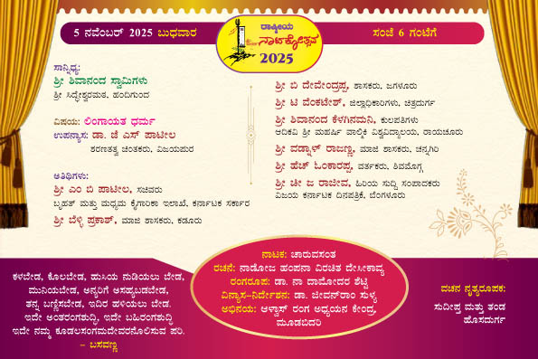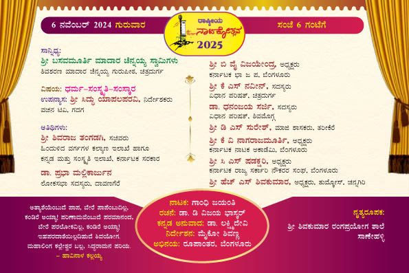 ದಿನಾಂಕ 06 ನವೆಂಬರ್ 2025ರಂದು ಸಂಜೆ 6-00 ಗಂಟೆಗೆ ಸಿದ್ಧು ಯಾಪಲಪರವಿ ಇವರಿಂದ ‘ಧರ್ಮ-ಸಂಸ್ಕೃತಿ-ಸಂಸ್ಕಾರ’ ಎಂಬ ವಿಷಯದ ಬಗ್ಗೆ ಉಪನ್ಯಾಸ, ಮೈಕೋ ಶಿವಣ್ಣ ಇವರ ನಿರ್ದೇಶನದಲ್ಲಿ ಬೆಂಗಳೂರಿನ ರೂಪಾಂತರ ಅಭಿನಯಿಸುವ ‘ಗಾಂಧಿ ಜಯಂತಿ’ ನಾಟಕ ಪ್ರದರ್ಶನಗೊಳ್ಳಲಿದೆ.
