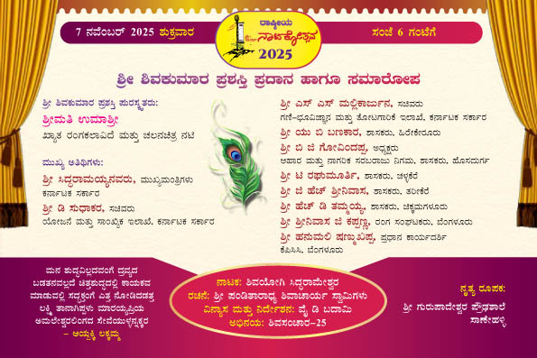 ದಿನಾಂಕ 07 ನವೆಂಬರ್ 2025ರಂದು ಸಂಜೆ 6-00 ಗಂಟೆಗೆ ಖ್ಯಾತ ರಂಗ ಕಲಾವಿದೆ ಮತ್ತು ಚಲನಚಿತ್ರ ನಟಿ ಶ್ರೀಮತಿ ಉಮಾಶ್ರೀ ಇವರಿಗೆ ‘ಶ್ರೀ ಶಿವಕುಮಾರ ಪ್ರಶಸ್ತಿ’ ಪ್ರದಾನ ಮಾಡಲಾಗುವುದು. ಶ್ರೀ ಗುರುಪಾದೇಶ್ವರ ಪ್ರೌಢಶಾಲೆಯ ವಿದ್ಯಾರ್ಥಿಗಳಿಂದ ನೃತ್ಯ ರೂಪಕ, ವೈ.ಡಿ. ಬದಾಮಿ ಇವರ ವಿನ್ಯಾಸ ಮತ್ತು ನಿರ್ದೇಶನದಲ್ಲಿ ‘ಶಿವಯೋಗಿ ಸಿದ್ಧರಾಮೇಶ್ವರ’ ನಾಟಕ ಪ್ರಸ್ತುತಗೊಳ್ಳಲಿದೆ.