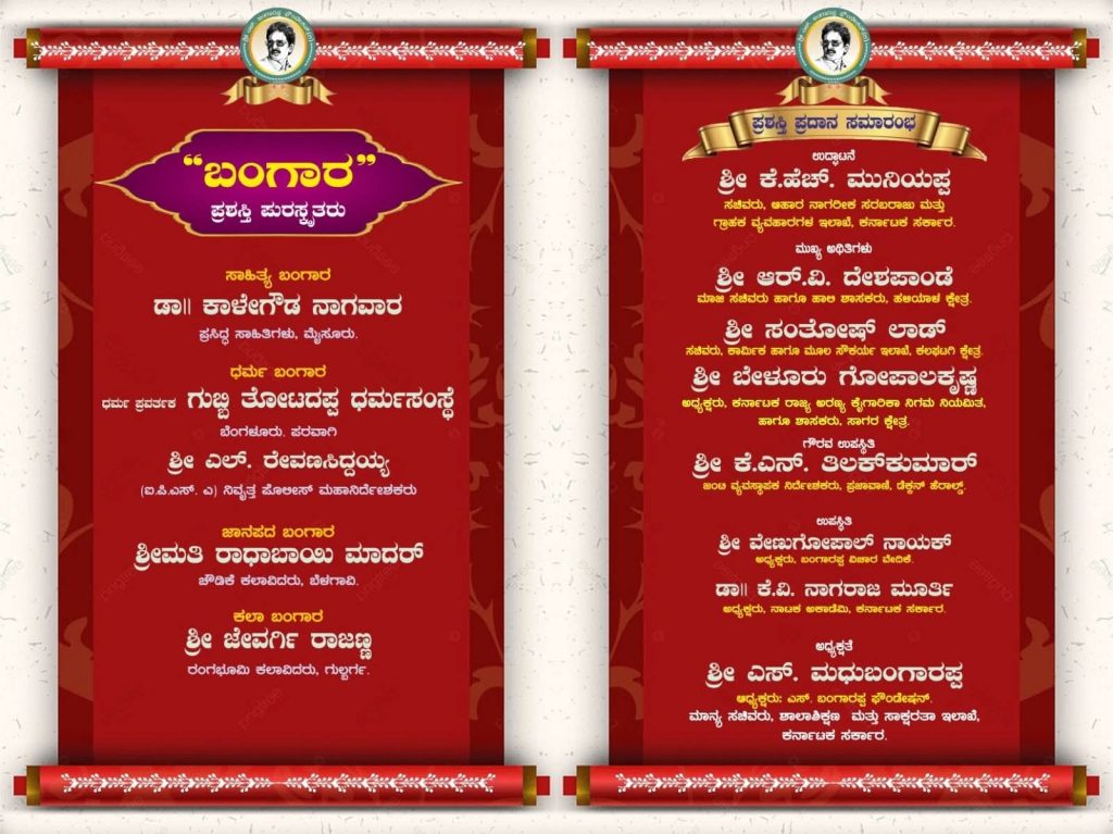 ಎಸ್. ಬಂಗಾರಪ್ಪ ಫೌಂಡೇಷನ್ ಇದರ ಅಧ್ಯಕ್ಷರಾದ ಎಸ್. ಮಧು ಬಂಗಾರಪ್ಪ ಇವರ ಅಧ್ಯಕ್ಷತೆಯಲ್ಲಿ ಈ ಸಮಾರಂಭವನ್ನು ಸಚಿವರಾದ ಕೆ.ಹೆಚ್. ಮುನಿಯಪ್ಪ ಇವರು ಉದ್ಘಾಟನೆ ಮಾಡಲಿದ್ದಾರೆ. ಪ್ರಸಿದ್ಧ ಸಾಹಿತಿಗಳಾದ ಡಾ. ಕಾಳೇಗೌಡ ನಾಗವಾರ ಇವರಿಗೆ ‘ಸಾಹಿತ್ಯ ಬಂಗಾರ’, ಬೆಂಗಳೂರಿನ ಗುಬ್ಬಿ ತೋಟದಪ್ಪ ಧರ್ಮಸಂಸ್ಥೆಗೆ ‘ಧರ್ಮ ಬಂಗಾರ’, ಚೌಡಿಕೆ ಕಲಾವಿದರಾದ ಶ್ರೀಮತಿ ರಾಧಾಬಾಯಿ ಮಾದರ್ ಇವರಿಗೆ ‘ಜಾನಪದ ಬಂಗಾರ’, ರಂಗಭೂಮಿ ಕಲಾವಿದರಾದ ಜೇವರ್ಗಿ ರಾಜಣ್ಣ ‘ಕಲಾ ಬಂಗಾರ’ ಪ್ರಶಸ್ತಿ ಪ್ರದಾನ ಮಾಡಲಾಗುವುದು. ಬೆಳಿಗ್ಗೆ 10-30 ಗಂಟೆಗೆ ಸೊರಬದಲ್ಲಿರುವ ಡಾ. ರಾಜ್ ಕುಮಾರ್ ರಂಗಮಂದಿರದಲ್ಲಿ ‘ಬಂಗಾರಪ್ಪನವರ ಚಿಂತನೆಗಳು’ ವಿಚಾರ ಸಂಕಿರಣ ನಡೆಯಲಿದೆ. ಪ್ರಸಿದ್ಧ ಕವಿಗಳಾದ ಪ್ರೊ. ಎಸ್.ಜಿ. ಸಿದ್ಧರಾಮಯ್ಯ ಇವರು ಈ ಕಾರ್ಯಕ್ರಮವನ್ನು ಉದ್ಘಾಟನೆ ಮಾಡಲಿದ್ದು, ಡಾ. ಕಾಳೇಗೌಡ ನಾಗವಾರ ಇವರು ಅಧ್ಯಕ್ಷತೆ ವಹಿಸಲಿದ್ದಾರೆ. ಕರ್ನಾಟಕ ಲೇಖಕಿಯರ ಸಂಘದ ಅಧ್ಯಕ್ಷರಾದ ಶ್ರೀಮತಿ ಹೆಚ್.ಎಲ್. ಪುಷ್ಪ ಮತ್ತು ಶಿವಮೊಗ್ಗ ಕನ್ನಡ ಸಾಹಿತ್ಯ ಪರಿಷತ್ತು ಇದರ ಅಧ್ಯಕ್ಷರಾದ ಡಾ. ಮಂಜುನಾಥ್ ಇವರು ‘ಸುಸ್ಥಿರ ಬದುಕು ಪ್ರಸ್ತುತತೆ’ ಎಂಬ ವಿಷಯದ ಬಗ್ಗೆ ವಿಚಾರ ಮಂಡನೆ ಮಾಡಲಿದ್ದಾರೆ. ಸಭಾ ಕಾರ್ಯಕ್ರಮದ ಬಳಿಕ ಮೂಡಬಿದಿರೆ ಆಳ್ವಾಸ್ ಶಿಕ್ಷಣ ಪ್ರತಿಷ್ಠಾನದ ವಿದ್ಯಾರ್ಥಿಗಳಿಂದ ‘ಆಳ್ವಾಸ್ ಸಾಂಸ್ಕೃತಿಕ ವೈಭವ’ ಪ್ರಸ್ತುತಗೊಳ್ಳಲಿದೆ.