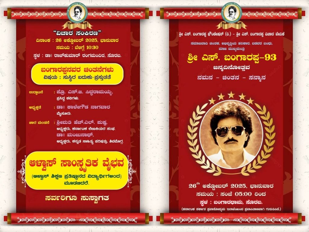 ಸೊರಬ : ಶ್ರೀ ಎಸ್. ಬಂಗಾರಪ್ಪ ಫೌಂಡೇಷನ್ (ರಿ.) ಹಾಗೂ ಶ್ರೀ ಎಸ್. ಬಂಗಾರಪ್ಪ ವಿಚಾರ ವೇದಿಕೆ ಇದರ ವತಿಯಿಂದ ಎಸ್. ಬಂಗಾರಪ್ಪ ಇವರ ಜನ್ಮ ದಿನೋತ್ಸವವನ್ನು ದಿನಾಂಕ 26 ಅಕ್ಟೋಬರ್ 2025ರಂದು ಶಿವಮೊಗ್ಗ ಜಿಲ್ಲೆಯ ಸೊರಬದ ಬಂಗಾರಧಾಮದಲ್ಲಿ ಆಯೋಜಿಸಲಾಗಿದೆ.