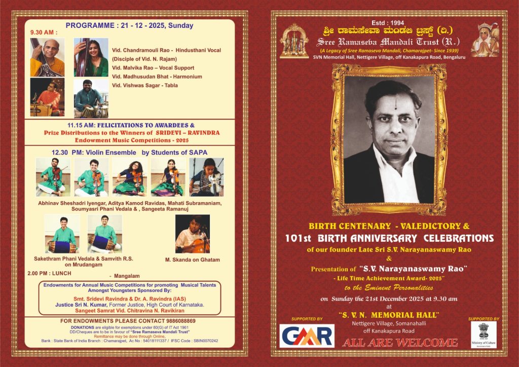 ಬೆಂಗಳೂರು : ಶ್ರೀ ರಾಮಸೇವಾ ಮಂಡಲಿ ಟ್ರಸ್ಟ್ (ರಿ.) ಇದರ ವತಿಯಿಂದ ಎಸ್.ವಿ. ನಾರಾಯಣಸ್ವಾಮಿ ರಾವ್ ಇವರ ಜನ್ಮ ದಿನಾಚರಣೆ ಮತ್ತು ಪ್ರಶಸ್ತಿ ಪ್ರದಾನ ಕಾರ್ಯಕ್ರಮವನ್ನು ದಿನಾಂಕ 21 ಡಿಸೆಂಬರ್ 2025ರಂದು ಬೆಳಿಗ್ಗೆ 9-30 ಗಂಟೆಗೆ ಬೆಂಗಳೂರು ನೆಟ್ಟಿಗೆರೆ ಗ್ರಾಮದ ಕನಕಪುರ ರಸ್ತೆಯಲ್ಲಿರುವ ಎಸ್.ವಿ.ಎನ್. ಸ್ಮಾರಕ ಭವನದಲ್ಲಿ ಆಯೋಜಿಸಲಾಗಿದೆ.