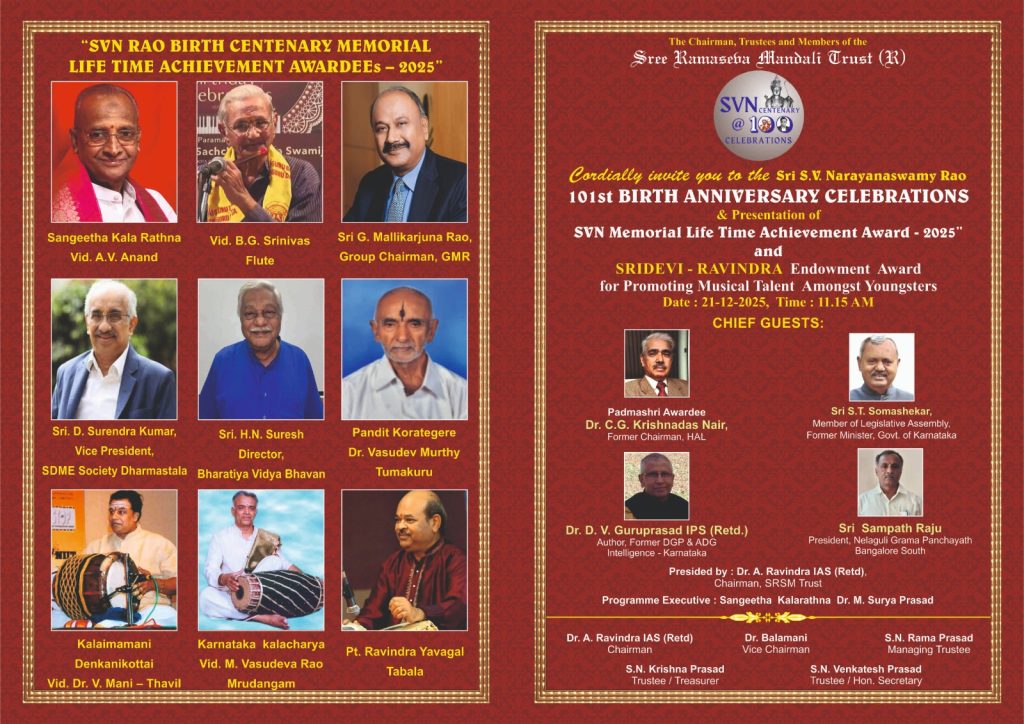 ಎಸ್.ವಿ. ನಾರಾಯಣಸ್ವಾಮಿ ರಾವ್ ಇವರ ಜನ್ಮ ದಿನಾಚರಣೆ ಮತ್ತು ಪ್ರಶಸ್ತಿ ಪ್ರದಾನ | ಡಿಸೆಂಬರ್ 21