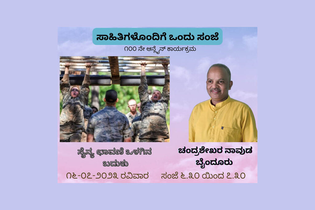 ಇದು ಈ ಸರಣಿ ಕಾರ್ಯಕ್ರಮದ 100ನೇ ಆವೃತ್ತಿಯಾಗಿದ್ದು, ಪ್ರಖ್ಯಾತ ಸಾಹಿತಿಯಾದ ಶ್ರೀ ಚಂದ್ರಶೇಖರ ನಾವುಡ ಬೈಂದೂರು ಈ ಬಾರಿ ಅತಿಥಿಯಾಗಿ ಭಾಗವಹಿಸಿ ‘ಸೈನ್ಯ ಛಾವಣಿ ಒಳಗಿನ ಬದುಕು’ ಎಂಬ ವಿಷಯದ ಬಗ್ಗೆ ಮಾತನಾಡಲಿದ್ದಾರೆ. ಈ ಆನ್ಲೈನ್ ಕಾರ್ಯಕ್ರಮವನ್ನು ಝೂಮ್ ಲಿಂಕ್ https://bit.ly/2UbE22Z, ಮೀಟಿಂಗ್ ಐಡಿ 5940765774 ಮತ್ತು ಪಾಸ್ ಕೋಡ್ imaksb ಮೂಲಕ ಭಾಗವಹಿಸಬಹುದು.