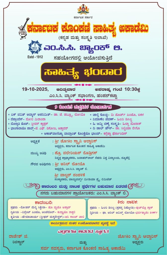 ಮಂಗಳೂರು : ಕರ್ನಾಟಕ ಕೊಂಕಣಿ ಸಾಹಿತ್ಯ ಅಕಾಡೆಮಿಯು ಹಂಪನ್ಕಟ್ಟಾದ ಎಂ.ಸಿ.ಸಿ. ಬ್ಯಾಂಕ್ ಲಿ. ಇದರ ಸಭಾಂಗಣದಲ್ಲಿ ದಿನಾಂಕ 19 ಅಕ್ಟೋಬರ್ 2025ರಂದು ಅಪರಾಹ್ನ 10-30 ಗಂಟೆಗೆ ‘ಸಾಹಿತ್ಯ ಭಂಡಾರ’ ಎಂಬ ಕಾರ್ಯಕ್ರಮವನ್ನು ಹಮ್ಮಿಕೊಂಡಿದೆ.