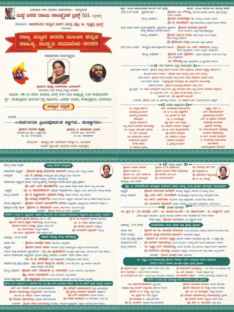 ಬೆಂಗಳೂರು : ಬುದ್ಧ ಬಸವ ಗಾಂಧಿ ಸಾಂಸ್ಕೃತಿಕ ಟ್ರಸ್ಟ್ (ರಿ.) ಸಿದ್ಧನಹಳ್ಳಿಯವರು ಅನಿಕೇತನ ಕನ್ನಡ ಬಳಗ ಮತ್ತು ಪ್ರೊ. ಬಿ. ಕೃಷ್ಣಪ್ಪ ಟ್ರಸ್ಟಿನ ಸಹಕಾರದಲ್ಲಿ ದಿನಾಂಕ 08 ನವೆಂಬರ್ 2025ರಂದು ಶನಿವಾರ ಬೆಂಗಳೂರಿನ ಶೇಷಾದ್ರಿಪುರಂ ಕಾಲೇಜಿನ ಸಭಾಂಗಣದಲ್ಲಿ ಹಿರಿಯ ಸಾಹಿತಿಗಳು, ಶರಣ ಸಂಸ್ಕೃತಿ ಚಿಂತಕಿ ಶ್ರೀಮತಿ ಪುಷ್ಪಾ ಬಸವರಾಜ ಬಣಕಾರ್ ಇವರ ಸರ್ವಾಧ್ಯಕ್ಷತೆಯಲ್ಲಿ ‘ರಾಜ್ಯ ಮಟ್ಟದ ಆರನೇ ಮಹಿಳಾ ಕನ್ನಡ ಸಾಹಿತ್ಯ ಸಂಸ್ಕೃತಿ ಸಮಾವೇಶ 2025’ವನ್ನು ಏರ್ಪಡಿಸಲಾಗಿದೆ.