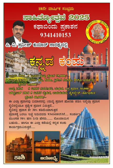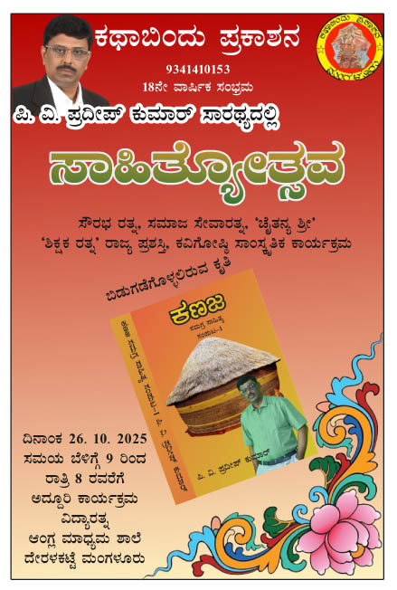 ಮಂಗಳೂರು : ಕಥಾಬಿಂದು ಪ್ರಕಾಶನ ಇದರ ವತಿಯಿಂದ ಪಿ.ವಿ. ಪ್ರದೀಪ್ ಕುಮಾರ್ ಸಾರಥ್ಯದಲ್ಲಿ ‘ಸಾಹಿತ್ಯೋತ್ಸವ’ವನ್ನು ದಿನಾಂಕ 26 ಅಕ್ಟೋಬರ್ 2025ರಂದು ಮಂಗಳೂರು ದೇರಳಕಟ್ಟೆಯಲ್ಲಿರುವ ವಿದ್ಯಾರತ್ನ ಆಂಗ್ಲ ಮಾಧ್ಯಮ ಶಾಲೆಯಲ್ಲಿ ಹಮ್ಮಿಕೊಳ್ಳಲಾಗಿದೆ. ಈ ಕಾರ್ಯಕ್ರಮದಲ್ಲಿ ಸೌರಭ ರತ್ನ, ಸಮಾಜ ಸೇವಾರತ್ನ, ‘ಚೈತನ್ಯ ಶ್ರೀ’, ‘ಶಿಕ್ಷಕ ರತ್ನ’ ರಾಜ್ಯ ಪ್ರಶಸ್ತಿ, ಕವಿಗೋಷ್ಠಿ ಮತ್ತು ಸಾಂಸ್ಕೃತಿಕ ಕಾರ್ಯಕ್ರಮ ನಡೆಯಲಿದೆ.