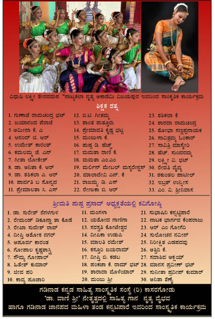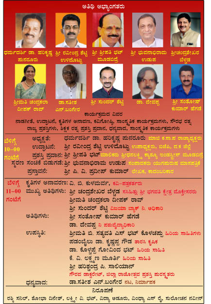 ಧರ್ಮದರ್ಶಿ ಡಾ. ಹರಿಕೃಷ್ಣ ಪುನರೂರು ಇವರ ಅಧ್ಯಕ್ಷತೆಯಲ್ಲಿ ರವೀಂದ್ರ ಶೆಟ್ಟಿ ಉಳಿದೊಟ್ಟು ಇವರು ಈ ಕಾರ್ಯಕ್ರಮವನ್ನು ಬಿಡುಗಡೆ ಮಾಡಲಿದ್ದಾರೆ. ಯುಗಪುರುಷ ಮಾಸ ಪತ್ರಿಕೆಯ ಸಂಪಾದಕರಾದ ಭುವನಾಭಿರಾಮ ಉಡುಪ ಇವರು ಸ್ಮರಣ ಸಂಚಿಕೆ ಬಿಡುಗಡೆ ಮತ್ತು ವಿ.ಬಿ. ಕುಳಮರ್ವ ಇವರು ಕೃತಿಗಳ ಅನಾವರಣ ಮಾಡಲಿದ್ದಾರೆ. ವಿವಿಧ ಕ್ಷೇತ್ರದ ಸಾಧಕರಿಗೆ ಪ್ರಶಸ್ತಿ ಪ್ರದಾನ, ವಿಜಯಪುರ ನಾಟ್ಯಕಲಾ ನೃತ್ಯ ಅಕಾಡೆಮಿ ಇವರಿಂದ ಸಾಂಸ್ಕೃತಿಕ ಕಾರ್ಯಕ್ರಮ, ಶ್ರೀಮತಿ ಪುಷ್ಪ ಪ್ರಸಾದ್ ಇವರ ಅಧ್ಯಕ್ಷತೆಯಲ್ಲಿ ಕವಿಗೋಷ್ಠಿ, ಡಾ. ವಾಣಿಶ್ರೀ ನೇತೃತ್ವದ ಗಡಿನಾಡ ಕನ್ನಡ ಸಾಹಿತ್ಯ ಸಾಂಸ್ಕೃತಿಕ ಸಂಸ್ಥೆಯಿಂದ ನೃತ್ಯ ವೈಭವ ಮತ್ತು ಗಡಿನಾಡ ಜಾನಪದ ಮಹಿಳಾ ತಂಡದವರಿಂದ ಸಾಂಸ್ಕೃತಿಕ ಕಾರ್ಯಕ್ರಮ ಜರಗಲಿದೆ.