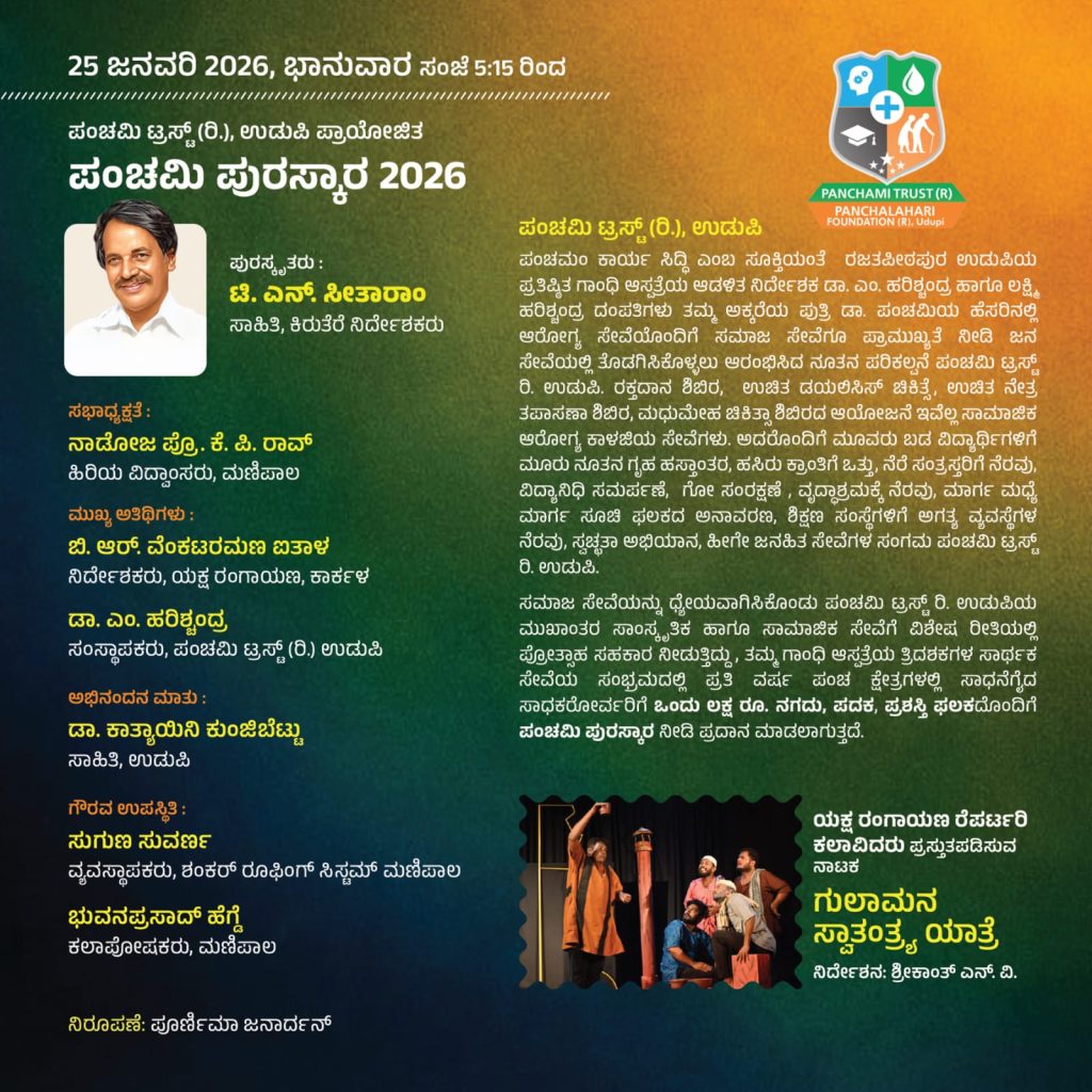 ದಿನಾಂಕ 25 ಜನವರಿ 2026ರಂದು ಸಾಹಿತಿ, ಕಿರುತೆರೆ ನಿರ್ದೇಶಕರಾದ ಟಿ.ಎನ್. ಸೀತಾರಾಂ ಇವರಿಗೆ ಪಂಚಮಿ ಟ್ರಸ್ಟ್ (ರಿ.) ಉಡುಪಿ ಪ್ರಾಯೋಜಿತ ‘ಪಂಚಮಿ ಪುರಸ್ಕಾರ 2026’ ಪ್ರದಾನ ಮಾಡಲಾಗುವುದು. ಹಿರಿಯ ವಿದ್ವಾಂಸರಾದ ನಾಡೋಜ ಪ್ರೊ. ಕೆ.ಪಿ. ರಾವ್ ಇವರು ಸಭಾಧ್ಯಕ್ಷತೆಯನ್ನು ವಹಿಸಲಿರುವರು. ಶ್ರೀಕಾಂತ್ ಎನ್.ವಿ. ನಿರ್ದೇಶನದಲ್ಲಿ ಯಕ್ಷ ರಂಗಾಯಣ ರೆಪರ್ಟರಿ ಕಲಾವಿದರು ‘ಗುಲಾಮನ ಸ್ವಾತಂತ್ರ್ಯ ಯಾತ್ರೆ’ ನಾಟಕವನ್ನು ಪ್ರಸ್ತುತ ಪಡಿಸಲಿರುವರು.