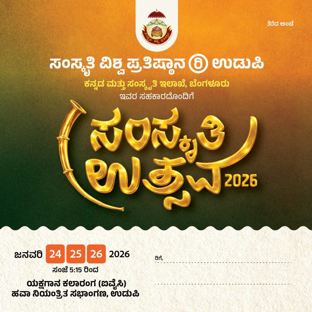 ಉಡುಪಿ : ಕನ್ನಡ ಮತ್ತು ಸಂಸ್ಕೃತಿ ಇಲಾಖೆ ಬೆಂಗಳೂರು ಇವರ ಸಹಯೋಗದೊಂದಿಗೆ ಸಂಸ್ಕೃತಿ ವಿಶ್ವ ಪ್ರತಿಷ್ಠಾನ (ರಿ.) ಉಡುಪಿ ಪ್ರತಿವರ್ಷ ನಡೆಸುವ ‘ಸಂಸ್ಕೃತಿ ಉತ್ಸವ 2026’ವನ್ನು ದಿನಾಂಕ 24, 25 ಮತ್ತು 26 ಜನವರಿ 2026ರಂದು ಸಂಜೆ ಗಂಟೆ 5-15ಕ್ಕೆ ಉಡುಪಿಯ ಯಕ್ಷಗಾನ ಕಲಾರಂಗದ ಐ.ವೈ.ಸಿ. ಹವಾ ನಿಯಂತ್ರಿತ ಸಭಾಂಗಣದಲ್ಲಿ ನಡೆಯಲಿದೆ.