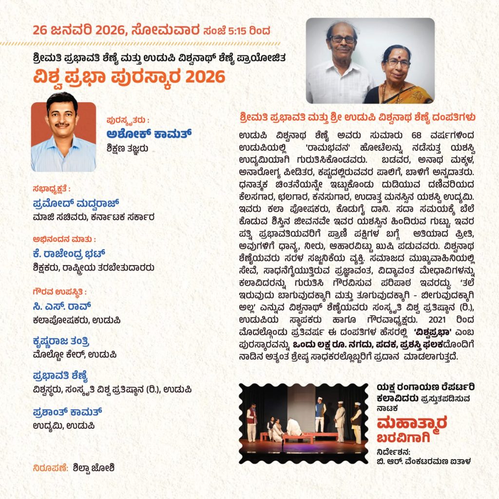 ದಿನಾಂಕ 26 ಜನವರಿ 2026ರಂದು ಸಭಾ ಕಾರ್ಯಕ್ರಮದ ಅಧ್ಯಕ್ಷತೆಯನ್ನು ಮಾಜಿ ಸಚಿವರಾದ ಪ್ರಮೋದ್ ಮದ್ವರಾಜ್ ಇವರು ವಹಿಸಲಿದ್ದು, ಶಿಕ್ಷಣ ತಜ್ಞರಾದ ಅಶೋಕ್ ಕಾಮತ್ ಇವರಿಗೆ ಶ್ರೀಮತಿ ಪ್ರಭಾವತಿ ಶೆಣೈ ಮತ್ತು ಉಡುಪಿ ವಿಶ್ವನಾಥ್ ಶೆಣೈ ಪ್ರಾಯೋಜಿತ ‘ವಿಶ್ವ ಪ್ರಭಾ ಪುರಸ್ಕಾರ 2026’ ಪ್ರದಾನ ಮಾಡಲಾಗುವುದು. ಸಭಾ ಕಾರ್ಯಕ್ರಮದ ಬಳಿಕ ಬಿ.ಆರ್. ವೆಂಕಟರಮಣ ಐತಾಳ ಇವರ ನಿರ್ದೇಶನದಲ್ಲಿ ಯಕ್ಷ ರಂಗಾಯಣ ರೆಪರ್ಟರಿ ಕಲಾವಿದರು ‘ಮಹಾತ್ಮಾರ ಬರವಿಗಾಗಿ’ ನಾಟಕ ಪ್ರದರ್ಶನ ನೀಡಲಿದ್ದಾರೆ.