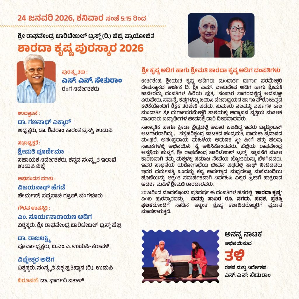 ದಿನಾಂಕ 24 ಜನವರಿ 2026ರಂದು ನಡೆಯುವ ಕಾರ್ಯಕ್ರಮದ ಸಭಾಧ್ಯಕ್ಷತೆಯನ್ನು ಕನ್ನಡ ಮತ್ತು ಸಂಸ್ಕೃತಿ ಇಲಾಖೆಯ ಸಹಾಯಕ ನಿರ್ದೇಶಕರಾದ ಶ್ರೀಮತಿ ಪೂರ್ಣಿಮಾ ಇವರು ವಹಿಸಲಿದ್ದು, ಡಾ. ಶಿವರಾಂ ಕಾರಂತ ಟ್ರಸ್ಟ್ ಇದರ ಅಧ್ಯಕ್ಷರಾದ ಡಾ. ಗಣನಾಥ ಎಕ್ಕಾರು ಇವರು ಉದ್ಘಾಟನೆ ಮಾಡಲಿದ್ದಾರೆ. ಇದೇ ಸಂದರ್ಭದಲ್ಲಿ ರಂಗ ನಿರ್ದೇಶಕರಾದ ಎಸ್.ಎನ್. ಸೇತುರಾಂ ಇವರಿಗೆ ಶ್ರೀ ರಾಘವೇಂದ್ರ ಚಾರಿಟೇಬಲ್ ಟ್ರಸ್ಟ್ (ರಿ.) ಹೆಬ್ರಿ ಪ್ರಾಯೋಜಿತ ‘ಶಾರದಾ ಕೃಷ್ಣ ಪುರಸ್ಕಾರ -2026’ ಪ್ರದಾನ ಮಾಡಲಾಗುವುದು. ಸಭಾ ಕಾರ್ಯಕ್ರಮದ ಬಳಿಕ ಎಸ್.ಎನ್. ಸೇತುರಾಂ ಇವರ ರಚನೆ ಮತ್ತು ನಿರ್ದೇಶನದಲ್ಲಿ ಅನನ್ಯ ನಾಟಕ ತಂಡ ಅಭಿನಯಿಸುವ ‘ತಳಿ’ ನಾಟಕ ಪ್ರದರ್ಶನಗೊಳ್ಳಲಿದೆ.