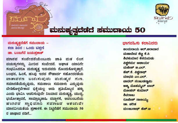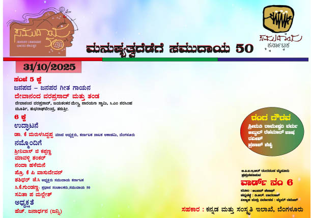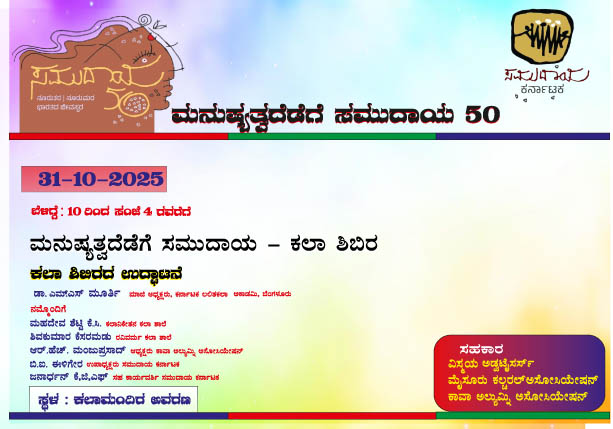 ದಿನಾಂಕ 31 ಅಕ್ಟೋಬರ್ 2025ರಂದು ಬೆಳಿಗ್ಗೆ 10-00 ಗಂಟೆಗೆ ಮನುಷ್ಯತ್ವದೆಡೆಗೆ ಸಮುದಾಯ ಕಲಾ ಶಿಬಿರದ ಉದ್ಘಾಟನೆಯನ್ನು ಕರ್ನಾಟಕ ಲಲಿತಕಲಾ ಅಕಾಡೆಮಿ ಮಾಜಿ ಅಧ್ಯಕ್ಷರಾದ ಡಾ. ಎಮ್.ಎಸ್. ಮೂರ್ತಿ ಇವರು ನೆರವೇರಿಸಲಿದ್ದಾರೆ. ಸಂಜೆ 5-00 ಗಂಟೆಗೆ ದೇವಾನಂದ ವರಪ್ರಸಾದ್ ಮತ್ತು ತಂಡದವರಿಂದ ಜನಪದ – ಜನಪರ ಗೀತ ಗಾಯನ ಪ್ರಸ್ತುತಿ, ಕರ್ನಾಟಕ ನಾಟಕ ಅಕಾಡೆಮಿ ಮಾಜಿ ಅಧ್ಯಕ್ಷರಾದ ಡಾ. ಕೆ. ಮರುಳಸಿದ್ಧಪ್ಪ ಇವರು ಉದ್ಘಾಟನೆ ಮಾಡಲಿದ್ದು, ಹೆಚ್. ಜನಾರ್ದನ ಇವರು ಅಧ್ಯಕ್ಷತೆ ವಹಿಸಲಿದ್ದಾರೆ. ಸಭಾ ಕಾರ್ಯಕ್ರಮದಲ್ಲಿ ಶ್ರೀಮತಿ ರಾಮೇಶ್ವರಿ ವರ್ಮ, ಅಬ್ದುಲ್ ರೆಹಮಾನ್ ಪಾಷ, ರವೀಶ್ ಮತ್ತು ಪ್ರಕಾಶ್ ಶೆಣೈ ಇವರಿಗೆ ರಂಗ ಗೌರವ, ಮೈಮ್ ರಮೇಶ್ ಇವರ ವಿನ್ಯಾಸ ಮತ್ತು ನಿರ್ದೇಶನದಲ್ಲಿ ಮೈಸೂರಿನ ಜಿ.ಪಿ.ಐ.ಇ.ಆರ್. ರಂಗತಂಡ ‘ವರ್ಡ್ ನಂ 6’ ನಾಟಕ ಪ್ರಸ್ತುತ ಪಡಿಸಲಿದ್ದಾರೆ.