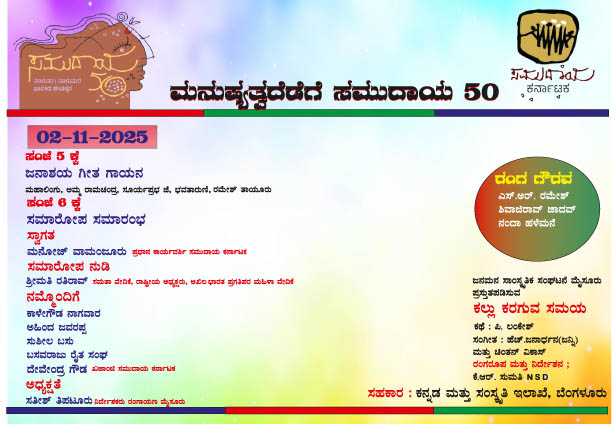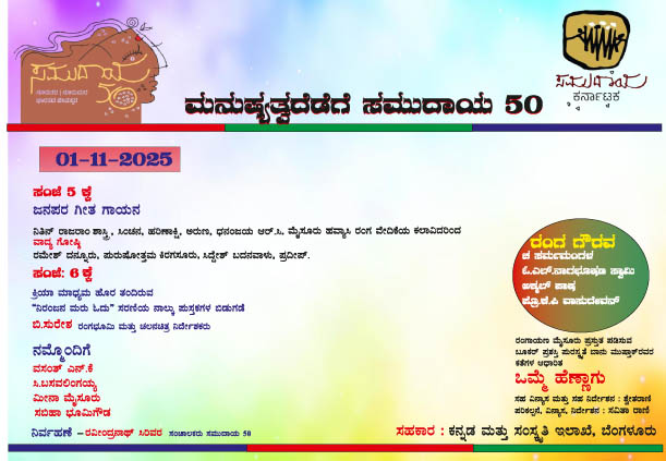 ದಿನಾಂಕ 01 ನವೆಂಬರ್ 2025ರಂದು ಸಂಜೆ 5-00 ಗಂಟೆಗೆ ಮೈಸೂರು ಹವ್ಯಾಸಿ ರಂಗ ವೇದಿಕೆಯ ಕಲಾವಿದರಿಂದ ಜನಪರ ಗೀತ ಗಾಯನ, ರಮೇಶ್ ದನ್ನೂರು, ಪುರುಷೋತ್ತಮ ಕಿರಗಸೂರು, ಸಿದ್ದೇಶ್ ಬದನವಾಳು ಮತ್ತು ಪ್ರದೀಪ್ ಇವರಿಂದ ವಾದ್ಯ ಗೋಷ್ಠಿ, ಕ್ರಿಯಾ ಮಾಧ್ಯಮ ಹೊರ ತಂದಿರುವ ‘ನಿರಂಜನ ಮರು ಓದು’ ಸರಣಿಯ ನಾಲ್ಕು ಪುಸ್ತಕಗಳ ಬಿಡುಗಡೆ ಹಾಗೂ ಚ. ಸರ್ಮಮಂಗಳ, ಓ.ಎಲ್. ನಾಗಭೂಷಣ ಸ್ವಾಮಿ, ಅಕ್ಮಲ್ ಪಾಷ ಮತ್ತು ಪ್ರೊ. ಕೆ.ಪಿ. ವಾಸುದೇವನ್ ಇವರಿಗೆ ರಂಗ ಗೌರವ, ಸವಿತಾ ರಾಣಿ ಪರಿಕಲ್ಪನೆ, ವಿನ್ಯಾಸ ಮತ್ತು ನಿರ್ದೇಶನದಲ್ಲಿ ರಂಗಾಯಣ ಮೈಸೂರು ಪಸ್ತುತ ಪಡಿಸುವ ಬಾನು ಮುಷ್ತಾಕ್ ಕತೆಗಳ ಆಧಾರಿತ ‘ಒಮ್ಮೆ ಹೆಣ್ಣಾಗು’ ನಾಟಕ ಪ್ರದರ್ಶನ ನಡೆಯಲಿದೆ.