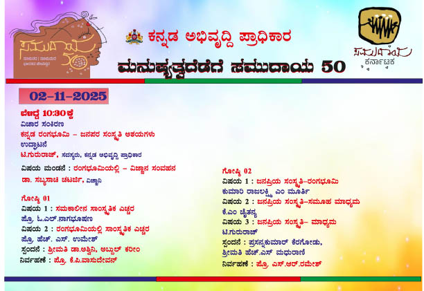 ದಿನಾಂಕ 02 ನವೆಂಬರ್ 2025ರಂದು ಬೆಳಿಗ್ಗೆ 10-30 ಗಂಟೆಗೆ ‘ಕನ್ನಡ ರಂಗಭೂಮಿ – ಜನಪರ ಸಂಸ್ಕೃತಿ ಆಶಯಗಳು’ ವಿಚಾರ ಸಂಕಿರಣದ ಉದ್ಘಾಟನೆಯನ್ನು ಕನ್ನಡ ಅಭಿವೃದ್ಧಿ ಪ್ರಾಧಿಕಾರದ ಸದಸ್ಯ ಟಿ. ಗುರುರಾಜ್ ಮಾಡಲಿದ್ದಾರೆ. ‘ರಂಗಭೂಮಿಯಲ್ಲಿ ವಿಜ್ಞಾನ ಸಂವಹನ’ ಎಂಬ ವಿಷಯದ ಬಗ್ಗೆ ಡಾ. ಸಬ್ಯಸಾಚಿ ಚಟರ್ಜಿ ಇವರು ವಿಷಯ ಮಂಡನೆ ಮಾಡಲಿದ್ದಾರೆ. ಗೋಷ್ಠಿ 1ರಲ್ಲಿ ಪ್ರೊ. ಓ.ಎಲ್. ನಾಗಭೂಷಣ ಇವರು ‘ಸಮಕಾಲೀನ ಸಾಂಸ್ಕೃತಿಕ ಎಚ್ಚರ’, ಪ್ರೊ. ಹೆಚ್.ಎಸ್. ಉಮೇಶ್ ಇವರು ‘ರಂಗಭೂಮಿಯಲ್ಲಿ ಸಾಂಸ್ಕೃತಿಕ ಎಚ್ಚರ’ ಹಾಗೂ ಗೋಷ್ಠಿ 2ರಲ್ಲಿ ಕುಮಾರಿ ರಾಜಲಕ್ಷ್ಮಿ ಎಂ. ಮೂರ್ತಿ ಇವರು ‘ಜನಪ್ರಿಯ ಸಂಸ್ಕೃತಿ – ರಂಗಭೂಮಿ’, ಕೆ.ಎಂ. ಚೈತನ್ಯ ಇವರು ‘ಜನಪ್ರಿಯ ಸಂಸ್ಕೃತಿ –ಸಮೂಹ ಮಾಧ್ಯಮ’ ಟಿ. ಗುರುರಾಜ್ ಇವರು ‘ಜನಪ್ರಿಯ ಸಂಸ್ಕೃತಿ – ಮಾಧ್ಯಮ’ ಎಂಬ ವಿಷಯದ ಬಗ್ಗೆ ವಿಷಯ ಮಂಡನೆ ಮಾಡಲಿದ್ದಾರೆ. ಸಂಜೆ 5-00 ಗಂಟೆಗೆ ಮಹಾಲಿಂಗು, ಅಮ್ಮ ರಾಮಚಂದ್ರ, ಸೂರ್ಯಪ್ರಭ ಜೆ., ಭವತಾರುಣಿ, ರಮೇಶ್ ತಾಯೂರು ಇವರಿಂದ ಜನಾಶಯ ಗೀತ ಗಾಯನ, 6-00 ಗಂಟೆಗೆ ಸಮಾರೋಪ ಸಮಾರಂಭದಲ್ಲಿ ಎಸ್.ಎಸ್. ರಮೇಶ್, ಶಿವಾಜಿ ರಾವ್ ಜಾದವ್ ಮತ್ತು ನಂದಾ ಹಳೆಮನೆ ಇವರಿಗೆ ರಂಗ ಗೌರವ, ಕೆ.ಆರ್. ಸುಮತಿ ಇವರ ರಂಗರೂಪ ಮತ್ತು ನಿರ್ದೇಶನದಲ್ಲಿ ಮೈಸೂರು ಜನಮನ ಸಾಂಸ್ಕೃತಿಕ ಸಂಘಟನೆ ಪ್ರಸ್ತುತ ಪಡಿಸುವ ‘ಕಲ್ಲು ಕರಗುವ ಸಮಯ’ ನಾಟಕ ಪ್ರದರ್ಶನಗೊಳ್ಳಲಿದೆ.
