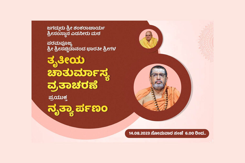 ಕಾಸರಗೋಡು : ಜಗದ್ಗುರು ಶ್ರೀ ಶಂಕರಾಚಾರ್ಯ ಶ್ರೀಸಂಸ್ಥಾನ ಎಡನೀರು ಮಠ ಪರಮಪೂಜ್ಯ ಶ್ರೀ ಶ್ರೀ ಸಚ್ಚಿದಾನಂದ ಭಾರತೀ ಶ್ರೀಗಳ ತೃತೀಯ ಚಾತುರ್ಮಾಸ್ಯ ವ್ರತಾಚರಣೆ ಪ್ರಯುಕ್ತ ‘ನೃತ್ಯಾರ್ಪಣಂ’ ಭರತನಾಟ್ಯ ಕಾರ್ಯಕ್ರಮವು ದಿನಾಂಕ 14-08-2023ರಂದು ಕಾಸರಗೋಡಿನ ಶ್ರೀ ಎಡನೀರು ಮಠದಲ್ಲಿ ನಡೆಯಲಿದೆ.