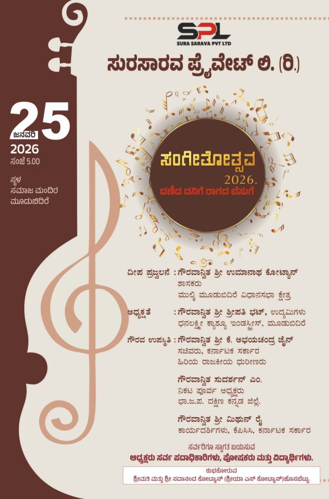 ಮೂಡುಬಿದಿರೆ : ಸುರಸಾರವ ಸಂಗೀತ ಶಾಲೆಯ ವತಿಯಿಂದ ದ್ವಿತೀಯ ವರ್ಷದ ‘ಸಂಗೀತೋತ್ಸವ-2026’ ದಣಿದ ದನಿಗೆ ರಾಗದ ಬೆಸುಗೆ ಕಾರ್ಯಕ್ರಮವನ್ನು ದಿನಾಂಕ 25 ಜನವರಿ 2026ರಂದು ಸಂಜೆ 5-00 ಗಂಟೆಗೆ ಮೂಡುಬಿದಿರೆಯ ಸಮಾಜ ಮಂದಿರದಲ್ಲಿ ಆಯೋಜಿಸಲಾಗಿದೆ.