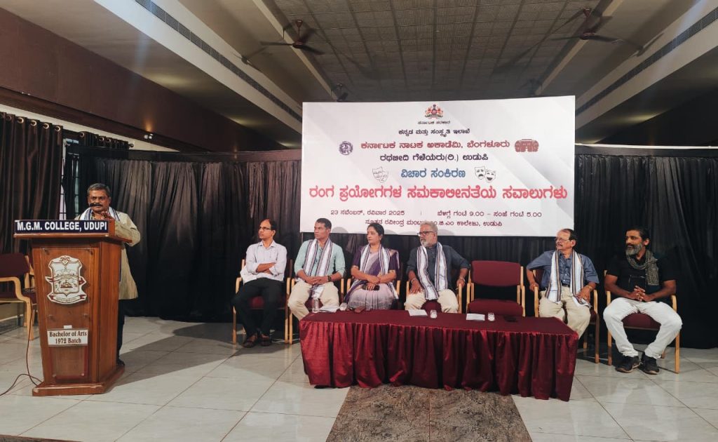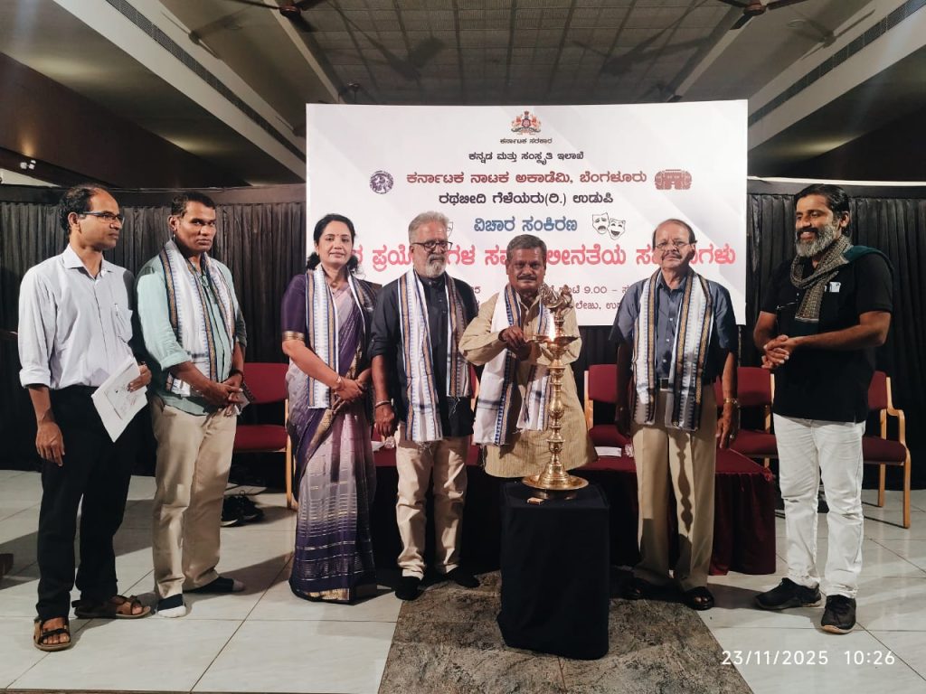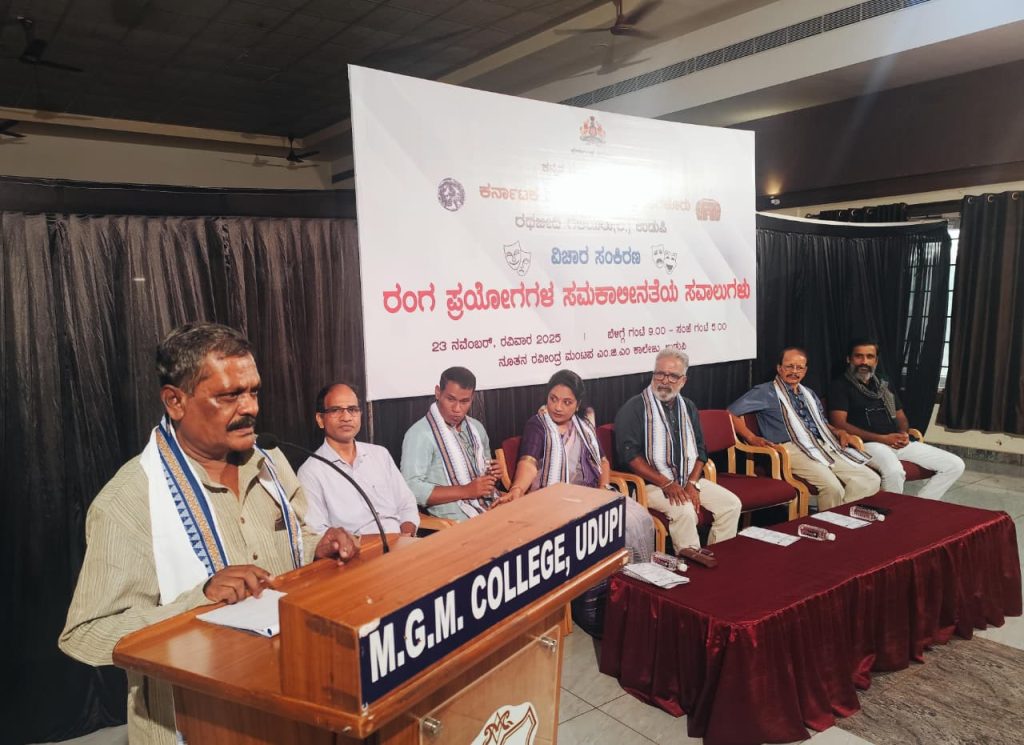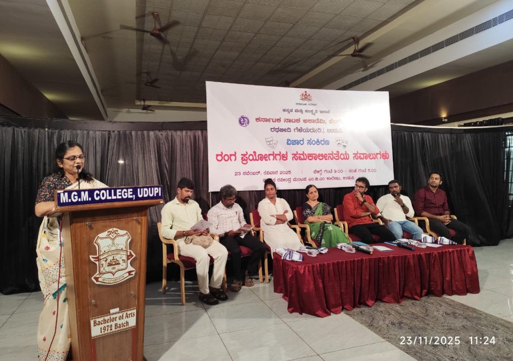 ಉಡುಪಿ : ಕನ್ನಡ ಮತ್ತು ಸಂಸ್ಕೃತಿ ಇಲಾಖೆ, ಕರ್ನಾಟಕ ನಾಟಕ ಅಕಾಡೆಮಿ ಬೆಂಗಳೂರು, ರಥಬೀದಿ ಗೆಳೆಯರು ವತಿಯಿಂದ ಉಡುಪಿ ಎಂ.ಜಿ.ಎಂ. ಕಾಲೇಜಿನ ನೂತನ ರವೀಂದ್ರ ಮಂಟಪದಲ್ಲಿ ದಿನಾಂಕ 23 ನವೆಂಬರ್ 2025ರಂದು ಆಯೋಜಿಸಲಾದ ‘ರಂಗ ಪ್ರಯೋಗಗಳ ಸಮಕಾಲೀನತೆಯ ಸವಾಲುಗಳು’ ಕುರಿತ ವಿಚಾರ ಸಂಕಿರಣ ನಡೆಯಿತು.