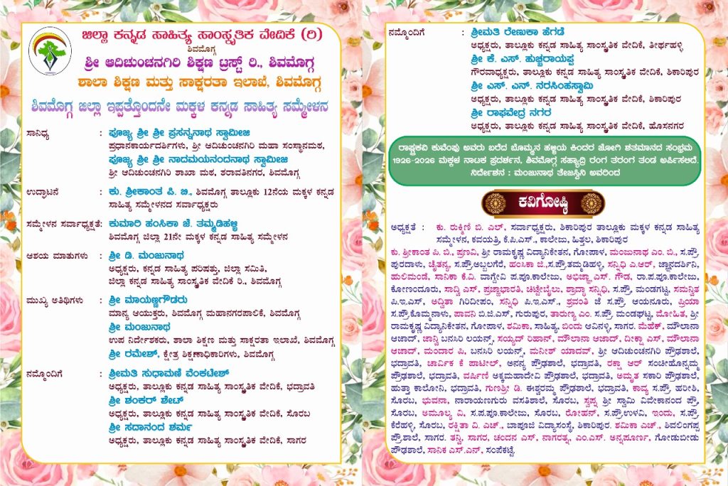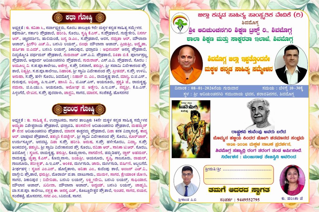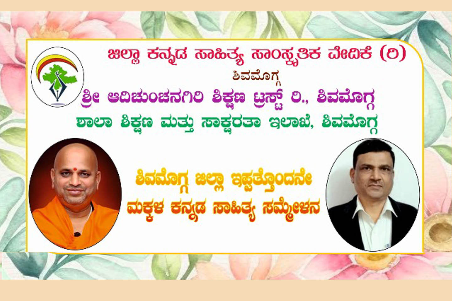 ಶಿವಮೊಗ್ಗ : ಜಿಲ್ಲಾ ಕನ್ನಡ ಸಾಹಿತ್ಯ ಸಾಂಸ್ಕೃತಿಕ ವೇದಿಕೆ (ರಿ.) ಶಿವಮೊಗ್ಗ, ಶ್ರೀ ಆದಿಚುಂಚನಗಿರಿ ಶಿಕ್ಷಣ ಟ್ರಸ್ಟ್ (ರಿ.) ಶಿವಮೊಗ್ಗ ಮತ್ತು ಶಾಲಾ ಶಿಕ್ಷಣ ಮತ್ತು ಸಾಕ್ಷರತಾ ಇಲಾಖೆ ಶಿವಮೊಗ್ಗ ಇವರ ನೇತೃತ್ವದಲ್ಲಿ ಶಿವಮೊಗ್ಗ ಜಿಲ್ಲಾ ಇಪ್ಪತ್ತೊಂದನೇ ಮಕ್ಕಳ ಕನ್ನಡ ಸಾಹಿತ್ಯ ಸಮ್ಮೇಳನವನ್ನು ದಿನಾಂಕ 08 ಜನವರಿ 2026ರಂದು ಬೆಳಗ್ಗೆ 10-30 ಗಂಟೆಗೆ ಶಿವಮೊಗ್ಗ ಶರಾವತಿ ನಗರದ ಶ್ರೀ ಆದಿಚುಂಚನಗಿರಿ ಸಮುದಾಯ ಭವನದಲ್ಲಿ ಹಮ್ಮಿಕೊಳ್ಳಲಾಗಿದೆ.