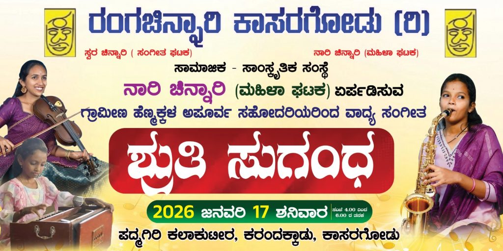 ಕಾಸರಗೋಡು : ಕಾಸರಗೋಡಿನ ಸಾಹಿತ್ಯಿಕ ಮತ್ತು ಸಾಂಸ್ಕೃತಿಕ ಸಂಸ್ಥೆಯಾದ ರಂಗಚಿನ್ನಾರಿ (ರಿ.) ಇದರ ಸಹ ಸಂಸ್ಥೆಗಳಲ್ಲಿ  ಒಂದಾದ ‘ನಾರಿ ಚಿನ್ನಾರಿ’ ಏರ್ಪಡಿಸುತ್ತಿರುವ ಗ್ರಾಮೀಣ ಹೆಣ್ಮಕ್ಕಳ ಅಪೂರ್ವ ಸಹೋದರಿಯರಿಂದ ವಾದ್ಯ ಸಂಗೀತ ‘ಶ್ರುತಿ ಸುಗಂಧ’ ದಿನಾಂಕ 17 ಜನವರಿ 2026ರಂದು ಕಾಸರಗೋಡಿನ ಕರಂದಕ್ಕಾಡಿನಲ್ಲಿರುವ ‘ಪದ್ಮಗಿರಿ ಕಲಾಕುಟೀರ’ದಲ್ಲಿ ನಡೆಯಲಿದೆ.