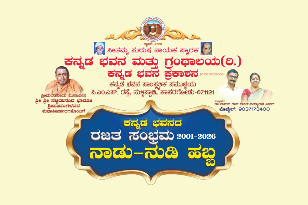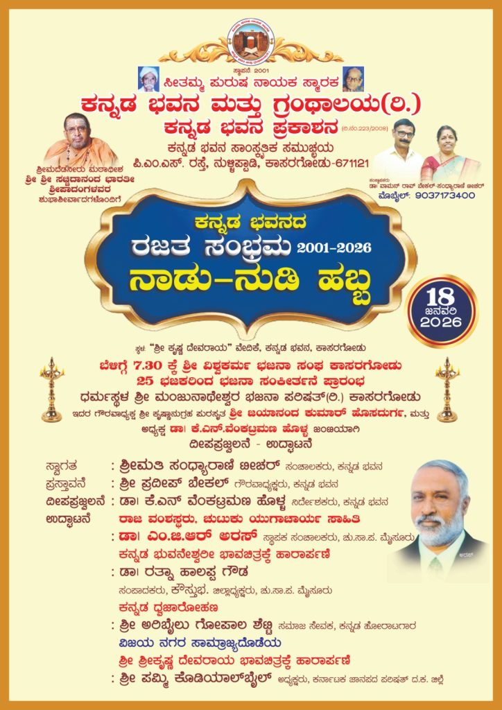 ಕಾಸರಗೋಡು : ನುಳ್ಳಿಪ್ಪಾಡಿಯ ಸೀತಮ್ಮ ಪುರುಷ ನಾಯಕ ಕನ್ನಡ ಭವನ ಗ್ರಂಥಾಲಯದ ಬಯಲು ರಂಗ ಮಂದಿರದಲ್ಲಿ ಕಾಸರಗೋಡಿನ ಕನ್ನಡ ಭವನದ ರಜತ ಸಂಭ್ರಮ, ನಾಡು-ನುಡಿ ಹಬ್ಬ, ಸಾಧಕರಿಗೆ ವಿವಿಧ ಪ್ರಶಸ್ತಿ ಪ್ರದಾನ, ಕೃತಿ ಬಿಡುಗಡೆ ಕಾರ್ಯಕ್ರಮವನ್ನು ದಿನಾಂಕ 18 ಜನವರಿ 2026ರಂದು ಹಮ್ಮಿಕೊಳ್ಳಲಾಗಿದೆ.