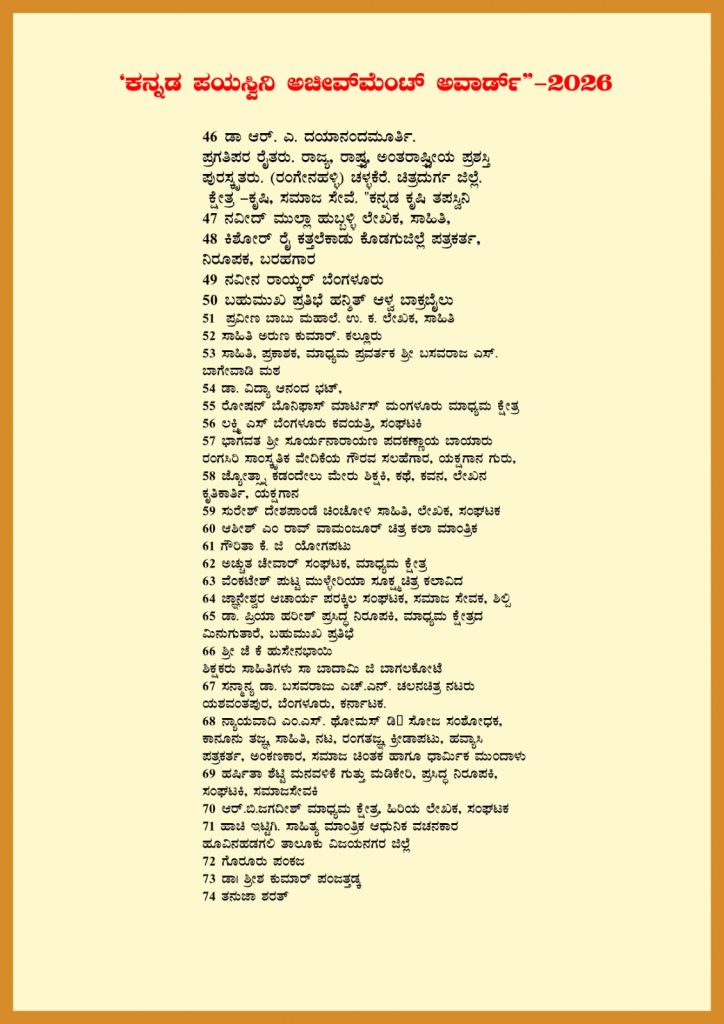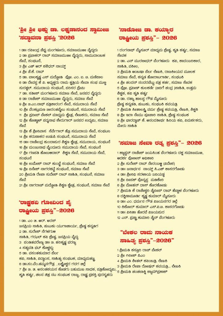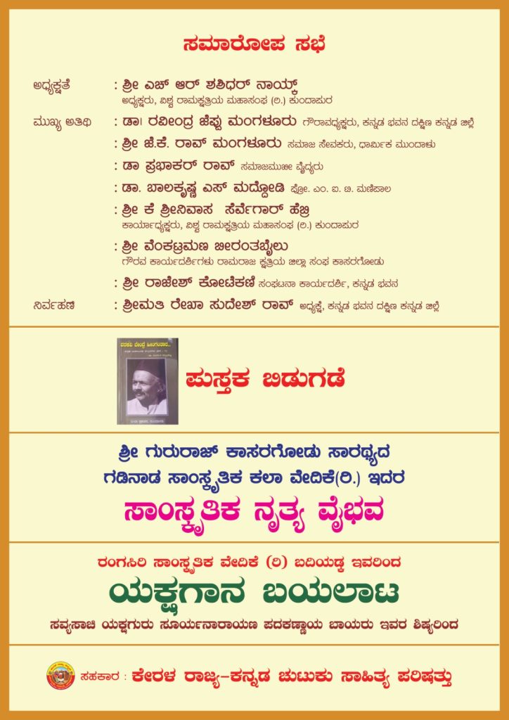 ಈ ಸಂದರ್ಭದಲ್ಲಿ ಕನ್ನಡದ ವಿವಿಧ ಕ್ಷೇತ್ರಗಳಲ್ಲಿ ಸಾಧನೆ ಮಾಡಿದ ಸಾಧಕರನ್ನು ಪ್ರಶಸ್ತಿಗಳನ್ನು ನೀಡಿ ಗೌರವಿಸಲಾಗುವುದು. ಕ್ಯಾಪ್ಟನ್ ಗಣೇಶ ಕಾರ್ಣಿಕ್, ಪ್ರದೀಪ್ ಕುಮಾರ ಕಲ್ಕೂರ, ಬೊಳ್ಳಜಿರ ಬಿ. ಅಯ್ಯಪ್ಪ, ರುಬೀನಾ ಎಂ.ಎ. ಪ್ರಶಸ್ತಿ ಪ್ರದಾನ ಮಾಡುವರು. ಕಾರ್ಯಕ್ರಮದಲ್ಲಿ ಗುರುರಾಜ್ ಕಾಸರಗೋಡು ಸಾರಥ್ಯದ ಗಡಿನಾಡ ಸಾಂಸ್ಕೃತಿಕ ಕಲಾ ವೇದಿಕೆಯ ಸದಸ್ಯರಿಂದ ನೃತ್ಯ ವೈಭವ, ಬದಿಯಡ್ಕದ ರಂಗಸಿರಿ ಸಾಂಸ್ಕೃತಿಕ ವೇದಿಕೆಯ ಸದಸ್ಯರಿಂದ ಯಕ್ಷಗುರು ಬಾಯಾರು ಸೂರ್ಯನಾರಾಯಣ ಪದಕಣ್ಣಾಯರ ನಿರ್ದೇಶನದಲ್ಲಿ ಯಕ್ಷಗಾನ ಬಯಲಾಟ ನಡೆಯಲಿದೆ. ಸಮಾರೋಪ ಸಮಾರಂಭದ ಅಧ್ಯಕ್ಷತೆಯನ್ನು ಎಚ್.ಆರ್. ಶಶಿಧರ ನಾಯ್ಕ್ ವಹಿಸಲಿದ್ದಾರೆ. ಮುಖ್ಯ ಅತಿಥಿಗಳಾಗಿ ಡಾ. ರವೀಂದ್ರ ಜೆಪ್ಪು, ಜಿ.ಕೆ. ರಾವ್ ಮಂಗಳೂರು, ಡಾ. ಪ್ರಭಾಕರ ರಾವ್, ಡಾ. ಬಾಲಕೃಷ್ಣ ಎಸ್. ಮುದ್ದೋಡಿ, ಕೆ. ಶ್ರೀನಿವಾಸ ಸೆರ್ವೆಗಾರ ಹೆಬ್ರಿ, ವೆಂಕಟ್ರಮಣ ಬೀರಂತಬೈಲ್ ಭಾಗವಹಿಸುವರು. ರಾಜೇಶ್ ಕೋಟೆಕಣಿ ಮತ್ತು ರೇಖಾ ಸುದೇಶ್ ರಾವ್ ಸಹಕರಿಸಲಿದ್ದಾರೆ.