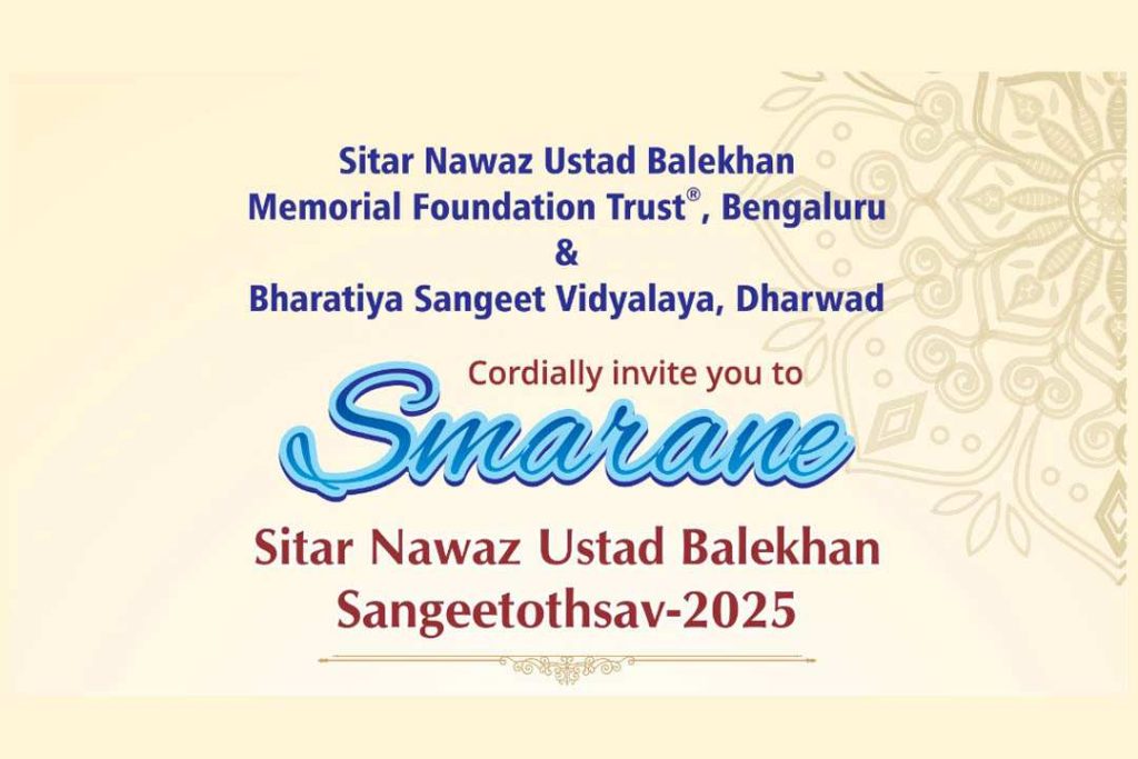 ಧಾರವಾಡ : ಸಿತಾರ್ ನವಾಜ್ ಉಸ್ತಾದ್ ಬಾಲೇಖಾನ್ ಮೆಮೋರಿಯಲ್ ಫೌಂಡೇಷನ್ ಟ್ರಸ್ಟ್ ಬೆಂಗಳೂರು ಮತ್ತು ಭಾರತೀಯ ಸಂಗೀತ್ ವಿದ್ಯಾಲಯ ಧಾರವಾಡ ಇವರು ಪ್ರಸ್ತುತ ಪಡಿಸುವ ‘ಸ್ಮರಣೆ’ ಸಿತಾರ್ ನವಾಜ್ ಉಸ್ತಾದ್ ಬಾಲೇಖಾನ್ ಸಂಗೀತೋತ್ಸವ -2025 ಕಾರ್ಯಕ್ರಮವನ್ನು ದಿನಾಂಕ 14 ಸೆಪ್ಟೆಂಬರ್ 2025ರಂದು ಧಾರವಾಡದ ಸೃಜನ ಅಣ್ಣಾಜಿ ರಾವ್ ಶೀರೂರ್ ರಂಗ ಮಂದಿರದಲ್ಲಿ ಹಮ್ಮಿಕೊಳ್ಳಲಾಗಿದೆ.