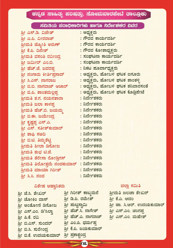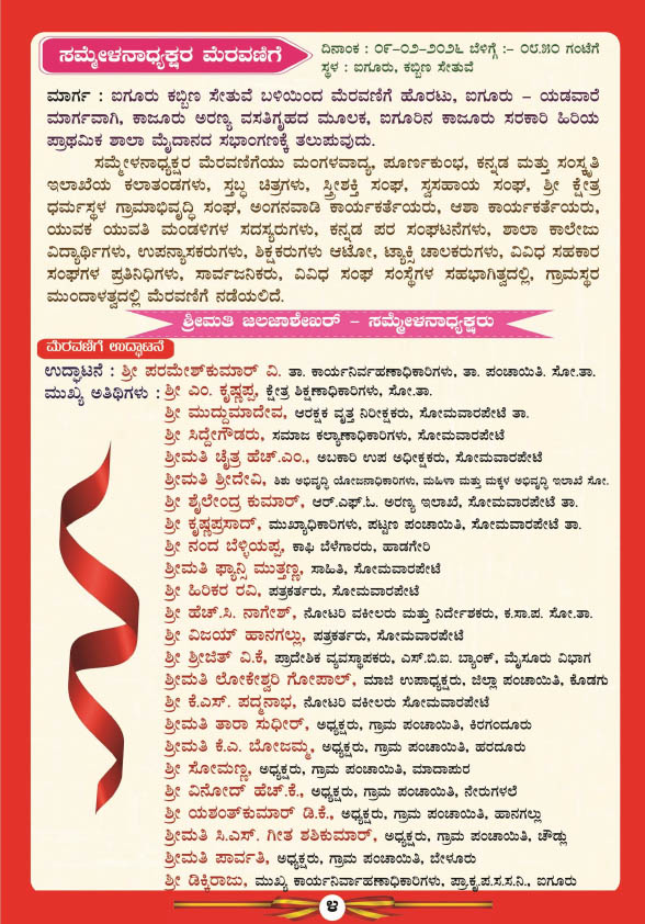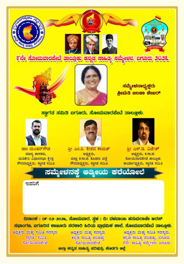 ಸೋಮವಾರಪೇಟೆ : ಐಗೂರಿನ ಕಾಜೂರು ಸರ್ಕಾರಿ ಹಿರಿಯ ಪ್ರಾಥಮಿಕ ಶಾಲೆಯಲ್ಲಿ 9ನೇ ಸೋಮವಾರಪೇಟೆ ತಾಲೂಕು ಕನ್ನಡ ಸಾಹಿತ್ಯ ಸಮ್ಮೇಳನವನ್ನು ದಿನಾಂಕ 09 ಫೆಬ್ರವರಿ 2026ರಂದು ಹಮ್ಮಿಕೊಳ್ಳಲಾಗಿದೆ.