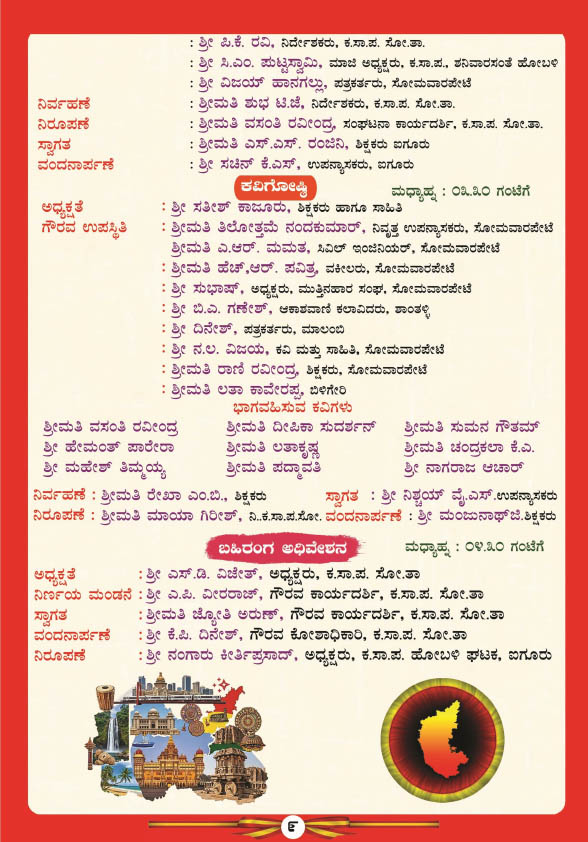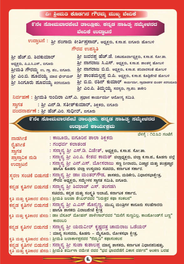 ಬೆಳಿಗ್ಗೆ 6-30ಕ್ಕೆ ಧ್ವಜಾರೋಹಣದೊಂದಿಗೆ ಸೋಮವಾರಪೇಟೆ ತಾಲೂಕು ದಂಡಾಧಿಕಾರಿ ಮತ್ತು ತಹಶೀಲ್ದಾರ್ ಕೆ.ಕೆ. ಕೃಷ್ಣಮೂರ್ತಿ ಇವರು ಕಾರ್ಯಕ್ರಮಕ್ಕೆ ಚಾಲನೆ ನೀಡಲಿದ್ದು, ನಂತರ ದ್ವಾರಗಳ ಉದ್ಘಾಟನಾ ಕಾರ್ಯಕ್ರಮ ನಡೆಯಲಿದೆ. ಬೆಳಿಗ್ಗೆ 8-50 ಗಂಟೆಗೆ ಸಮ್ಮೇಳನಾಧ್ಯಕ್ಷೆ ಜಲಜಾ ಶೇಖರ್ ಇವರೊಂದಿಗೆ ಮೆರವಣಿಗೆ ಐಗೂರು ಕಬ್ಬಿಣ ಸೇತುವೆಯಿಂದ ಆರಂಭವಾಗಲಿದ್ದು, ಪರಮೇಶ್ ಕುಮಾರ್ ವಿ. ಇವರು ಉದ್ಘಾಟನೆ ಮಾಡಲಿದ್ದಾರೆ. ಬಳಿಕ ಸಮ್ಮೇಳನದ ಪ್ರವೇಶ ದ್ವಾರ, ಸಮ್ಮೇಳನದ ಸಭಾಂಗಣ, ವಿವಿಧ ಮಳಿಗೆಗಳ ಮತ್ತು ಸಮ್ಮೇಳನದ ವೇದಿಕೆ ಉದ್ಘಾಟನೆ ನಡೆಯಲಿದೆ. 10-30 ಗಂಟೆಗೆ ಎನ್.ಎಸ್. ಬೋಸರಾಜು ಇವರು ಸಮ್ಮೇಳನದ ಉದ್ಘಾಟನೆ ಮಾಡಲಿದ್ದು, ಸ್ಮರಣ ಸಂಚಿಕೆ ಮತ್ತು ಕನ್ನಡ ಕೃತಿಗಳು ಬಿಡುಗಡೆಗೊಳ್ಳಲಿದೆ.