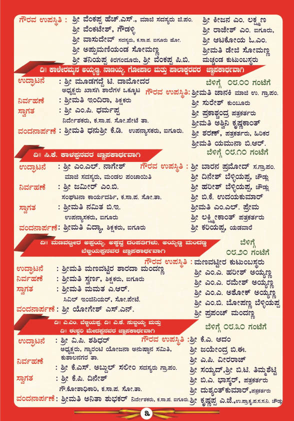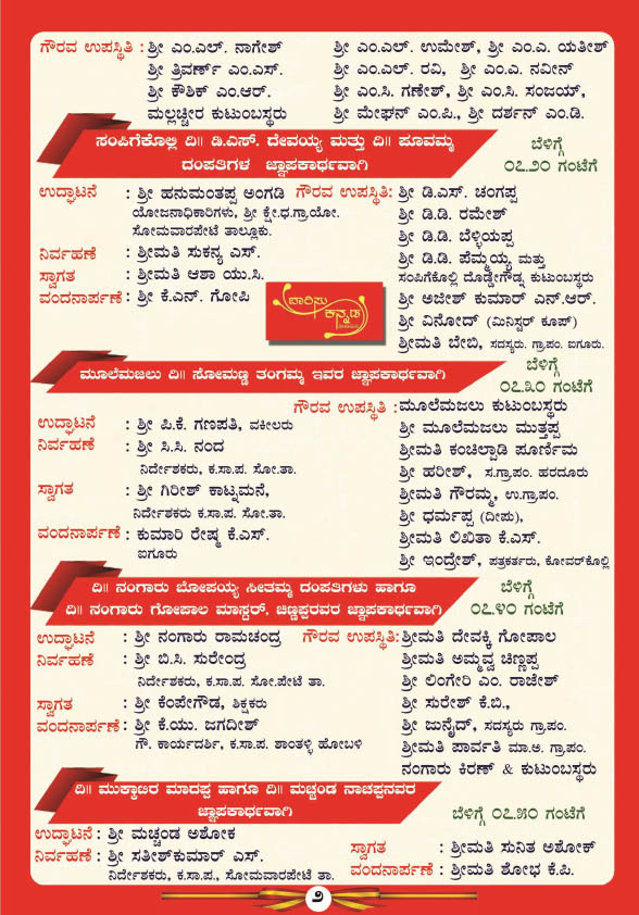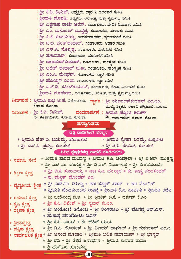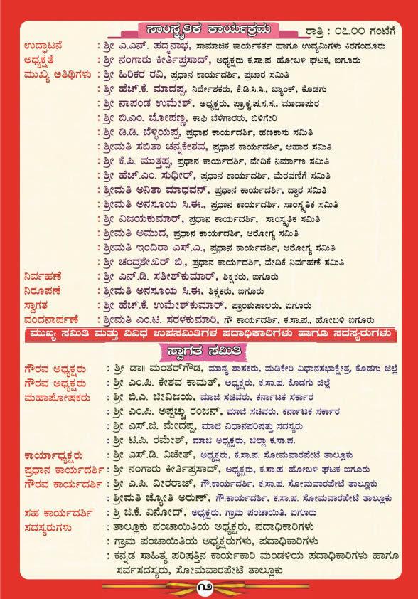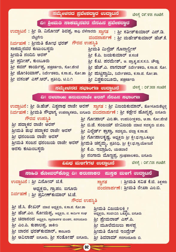 ಮಧ್ಯಾಹ್ನ 1-30 ಗಂಟೆಗೆ ಗೀತ ಗಾಯನ ಕಾರ್ಯಕ್ರಮ, 2-30 ಗಂಟೆಗೆ ವಿಚಾರಗೋಷ್ಠಿ, 3-30 ಗಂಟೆಗೆ ಕವಿಗೋಷ್ಠಿ, 4-30 ಗಂಟೆಗೆ ಬಹಿರಂಗ ಅಧಿವೇಶನ ಹಾಗೂ 5-00 ಗಂಟೆಗೆ ನಡೆಯಲಿರುವ ಸಮಾರೋಪ ಸಮಾರಂಭದಲ್ಲಿ ದತ್ತಿ ದಾನಿಗಳಿಗೆ ಹಾಗೂ ವಿವಿಧ ಕ್ಷೇತ್ರದಲ್ಲಿ ಸಾಧನೆ ಮಾಡಿದ ಸಾಧಕರಿಗೆ ಸನ್ಮಾನ ಮತ್ತು ಸಾಂಸ್ಕೃತಿಕ ಕಾರ್ಯಕ್ರಮ ನಡೆಯಲಿದೆ.