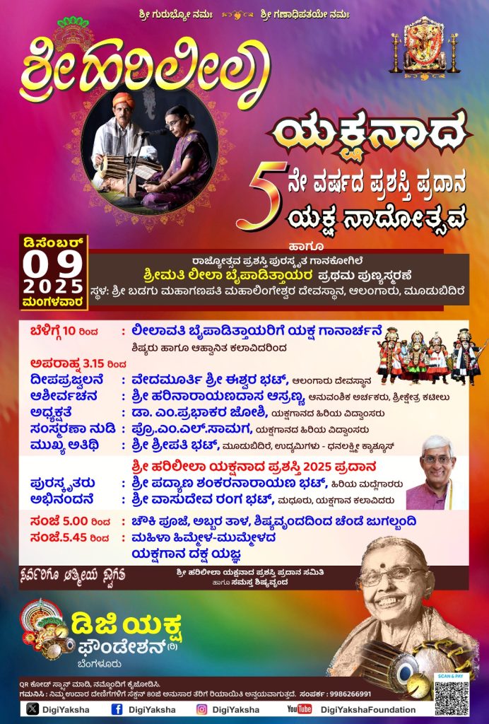 ಮೂಡುಬಿದಿರೆ : ಶ್ರೀ ಹರಿಲೀಲಾ ಯಕ್ಷನಾದ ಪ್ರಶಸ್ತಿ ಪ್ರದಾನ ಸಮಿತಿ, ಬೈಪಾಡಿತ್ತಾಯರು ಸ್ಥಾಪಿಸಿರುವ ಡಿಜಿ ಯಕ್ಷ ಫೌಂಡೇಶನ್ (ರಿ.) ಬೆಂಗಳೂರು ಸಹಯೋಗದಲ್ಲಿ ಹಾಗೂ ಅವರ ಸಮಸ್ತ ಶಿಷ್ಯ ವೃಂದದವರ ಸಹಕಾರದಲ್ಲಿ ದಿನಾಂಕ 09 ಡಿಸೆಂಬರ್ 2025ರಂದು ಮೂಡುಬಿದಿರೆ ಆಲಂಗಾರು ಶ್ರೀ ಬಡಗು ಮಹಾಗಣಪತಿ ಮಹಾಲಿಂಗೇಶ್ವರ ದೇವಳದ ವಠಾರದಲ್ಲಿ ಪ್ರಶಸ್ತಿ ಪ್ರದಾನ, ಯಕ್ಷ ನಾದೋತ್ಸವ ಮತ್ತು ಪುಣ್ಯಸ್ಮರಣೆ ಕಾರ್ಯಕ್ರಮ ನಡೆಯಲಿದೆ.