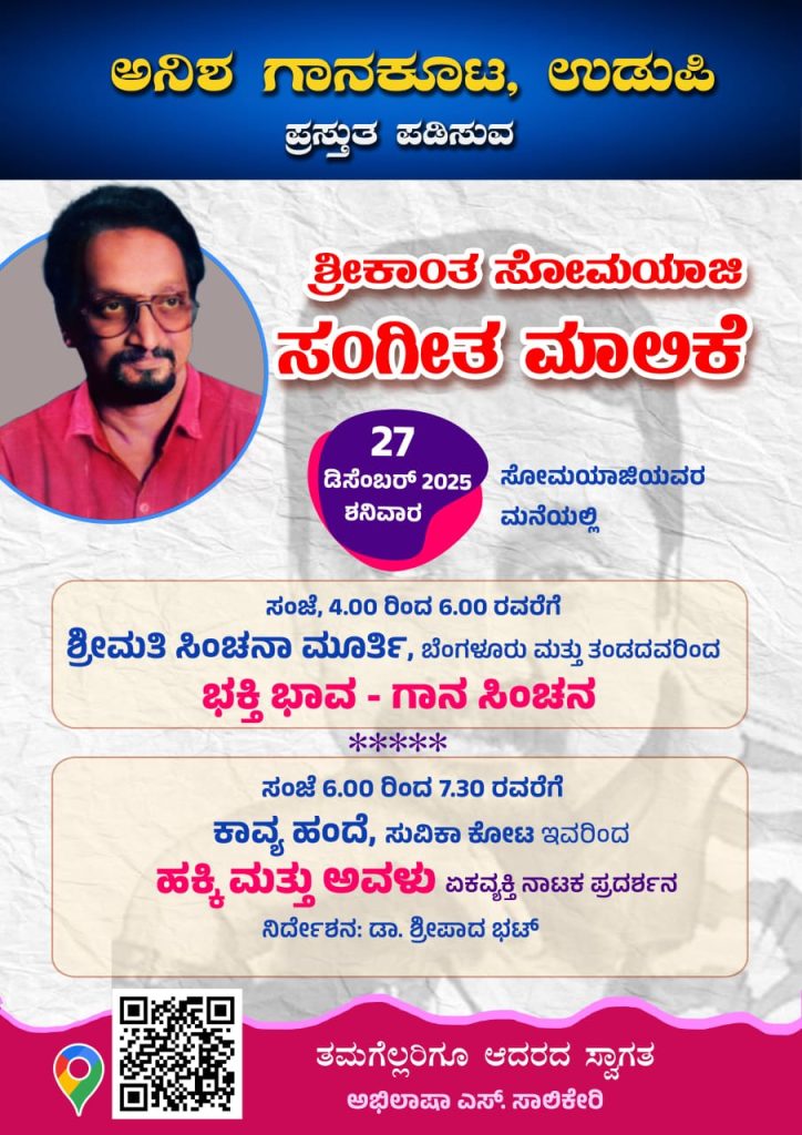 ಉಡುಪಿ : ಅನಿಶ ಗಾನಕೂಟ ಉಡುಪಿ ಪ್ರಸ್ತುತ ಪಡಿಸುವ ‘ಶ್ರೀಕಾಂತ ಸೋಮಯಾಜಿ ಸಂಗೀತ ಮಾಲಿಕೆ’ ಕಾರ್ಯಕ್ರಮವನ್ನು ದಿನಾಂಕ 27 ಡಿಸೆಂಬರ್ 2025ರಂದು ಸೋಮಯಾಜಿಯವರ ಮನೆಯಲ್ಲಿ ಆಯೋಜಿಸಲಾಗಿದೆ.