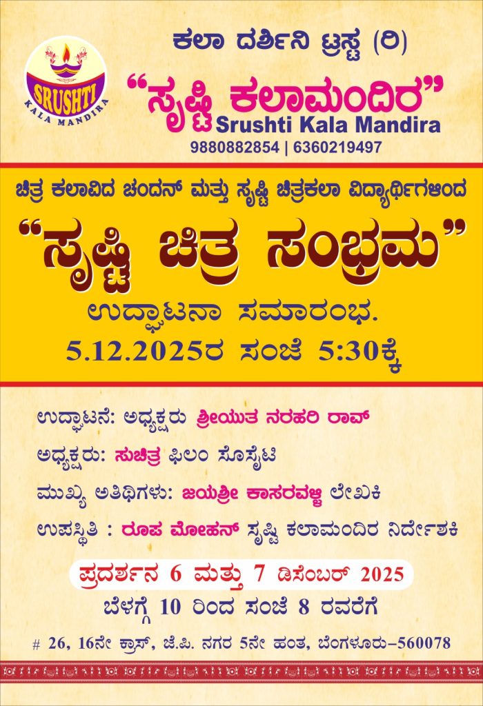 ಬೆಂಗಳೂರು : ಕಲಾ ದರ್ಶಿನಿ ಟ್ರಸ್ಟ್ (ರಿ.) ಮತ್ತು ಸೃಷ್ಟಿ ಕಲಾಮಂದಿರ ಇವರ ಸಹಯೋಗದಲ್ಲಿ ಚಿತ್ರ ಕಲಾವಿದ ಚಂದನ್ ಮತ್ತು ಸೃಷ್ಟಿ ಚಿತ್ರಕಲಾ ವಿದ್ಯಾರ್ಥಿಗಳಿಂದ ‘ಸೃಷ್ಟಿ ಚಿತ್ರ ಸಂಭ್ರಮ’ ಇದರ ಉದ್ಘಾಟನಾ ಸಮಾರಂಭವು ದಿನಾಂಕ 05 ಡಿಸೆಂಬರ್ 2025ರಂದು ಸಂಜೆ 5-30 ಗಂಟೆಗೆ ಬೆಂಗಳೂರಿನ ಸೃಷ್ಟಿ ಕಲಾಮಂದಿರದಲ್ಲಿ ನಡೆಯಲಿದೆ.