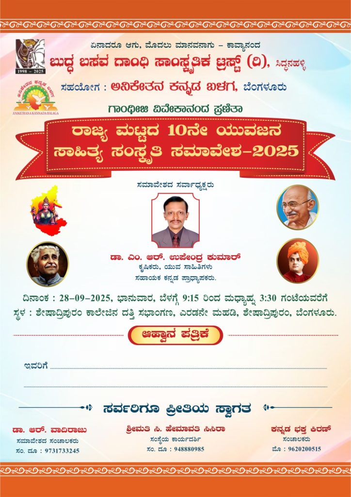 ಬೆಂಗಳೂರು : ಬುದ್ಧ ಬಸವ ಗಾಂಧಿ ಸಾಂಸ್ಕೃತಿಕ ಟ್ರಸ್ಟ್ (ರಿ). ಸಿದ್ಧನಹಳ್ಳಿ ಇದರ ವತಿಯಿಂದ ಅನಿಕೇತನ ಕನ್ನಡ ಬಳಗ ಬೆಂಗಳೂರು ಇವರ ಸಹಯೋಗದೊಂದಿಗೆ ಆಯೋಜಿಸಿರುವ ಗಾಂಧಿ ವಿವೇಕಾನಂದ ಪ್ರಣಿತಾ ರಾಜ್ಯ ಮಟ್ಟದ 10ನೇ ಯುವಜನ ಸಾಹಿತ್ಯ ಸಂಸ್ಕೃತಿ ಸಮ್ಮೇಳನವನ್ನು ದಿನಾಂಕ 28 ಸೆಪ್ಟೆಂಬರ್ 2025ರಂದು ಬೆಳಗ್ಗೆ 9-15 ಗಂಟೆಗೆ ಬೆಂಗಳೂರಿನ ಶೇಷಾದ್ರಿಪುರಂ ಕಾಲೇಜಿನ ಸಭಾಂಗಣದಲ್ಲಿ ಕವಿಗಳು, ಕೃಷಿಕರು, ಕನ್ನಡ ಉಪನ್ಯಾಸಕರು ಆಗಿರುವ ಡಾ. ಎಂ.ಆರ್.ಉಪೇಂದ್ರ ಕುಮಾರ್ ಇವರ ಸರ್ವಾಧ್ಯಕ್ಷತೆಯಲ್ಲಿ ಆಯೋಜಿಸಲಾಗಿದೆ.