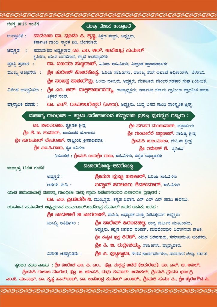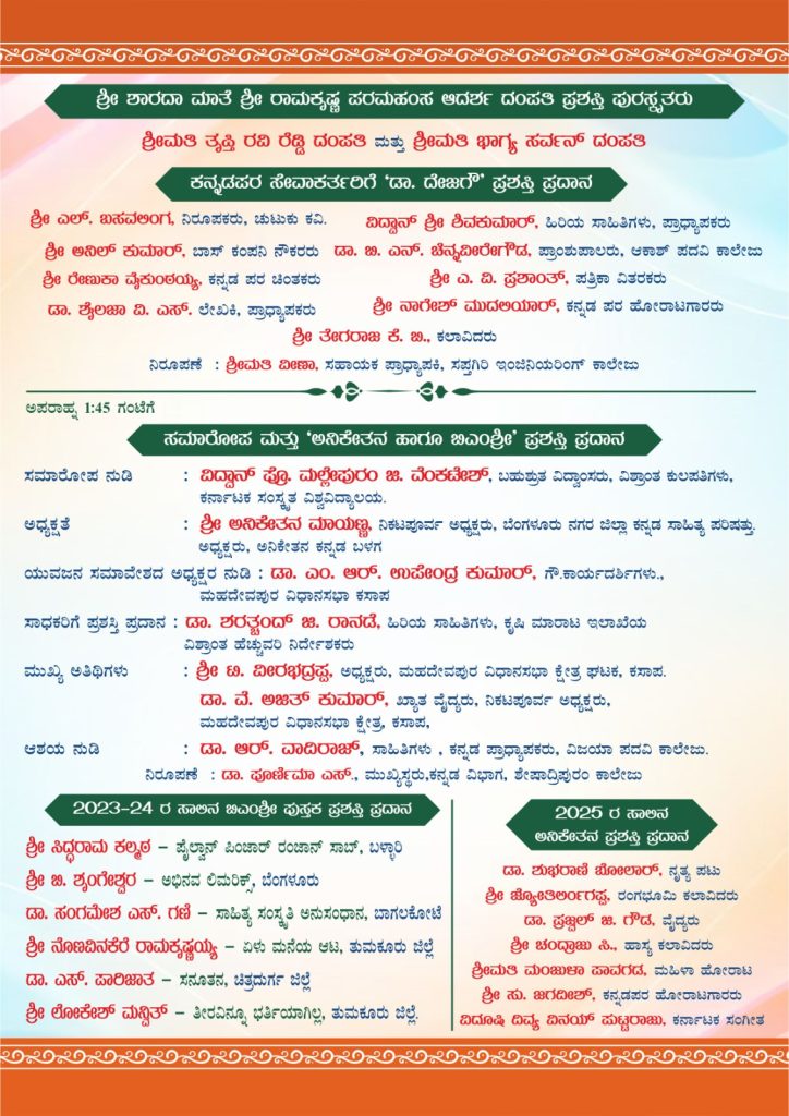 ಕಾರ್ಯಕ್ರಮವನ್ನು ಶಿಕ್ಷಣ ತಜ್ಞ, ಗಾಂಧಿ ಭವನದ ಅಧ್ಯಕ್ಷರಾದ ಡಾ. ವೂಡೇ ಪಿ. ಕೃಷ್ಣ ಉದ್ಘಾಟಿಸಲಿದ್ದು, ಪ್ರಸಿದ್ಧ ವಿದ್ವಾಂಸರಾದ ಡಾ. ವಿಜಯಾ ಸುಬ್ಬರಾಜ್ ವಿವಿಧ ಕ್ಷೇತ್ರಗಳಲ್ಲಿ ಸಾಧನೆಗೈದ ಮಹನೀಯರಿಗೆ ಗಾಂಧೀಜಿ ವಿವೇಕಾನಂದ ಸದ್ಭಾವನಾ ಪ್ರಶಸ್ತಿ ಪ್ರದಾನ ಮಾಡಲಿದ್ದಾರೆ. ಮುಖ್ಯ ಅತಿಥಿಗಳಾಗಿ ಗ್ರಾಮೀಣ ಶಾಲಾ ಶಿಕ್ಷಕರ ಸಂಘದ ಎಂ.ಆರ್. ಮಲ್ಲಿಕಾರ್ಜುನಯ್ಯ, ವಕೀಲರಾದ ನಂಜಪ್ಪ ಕಾಳೇಗೌಡ್ರು, ಹಿರಿಯ ಸಾಹಿತಿಗಳಾದ ಸುರೇಶ್ ಕೋರಕೊಪ್ಪ ಭಾಗವಹಿಸುವರು. ಇದೇ ಸಂದರ್ಭದಲ್ಲಿ ಬಿಎಂಶ್ರೀ ಪ್ರತಿಷ್ಠಾನದ ಕಾರ್ಯದರ್ಶಿ ಡಾ. ಶಾಂತರಾಜು, ಪತ್ರಕರ್ತ ಪರಿಸರ ಮಂಜುನಾಥ್, ಶಿಕ್ಷಕಿ ಜಿ.ಬಿ. ಮಾಲಾ, ಕ್ರೀಡಾಭಿಮಾನಿ‌ ಸುಗುಮಾರನ್ ದೇವರಾಜ್, ಸಾಮಾಜಿಕ ಹೋರಾಟಗಾರ ಕೆ.ಜಿ. ಕುಮಾರ್, ಸಾಹಿತಿ ಗುಂಡೀಗೆರೆ ವಿಶ್ವನಾಥ್ ಹಾಗೆಯೇ ಸಮಾರೋಪ ಸಮಾರಂಭದಲ್ಲಿ ಅನಿಕೇತನ ಪ್ರಶಸ್ತಿಗೆ ಖ್ಯಾತ ನೃತ್ಯಪಟು ಡಾ. ಶುಭಾರಾಣಿ ಬೋಲಾರ್, ಪ್ರಗತಿಪರ ಕೃಷಿಕ ಎಂ.ಸಿ. ರಾಜು, ಯುವ ವೈದ್ಯ ಡಾ. ಪ್ರಜ್ವಲ್ ಜಿ. ಗೌಡ, ಕನ್ನಡ ಚಳುವಳಿಯ ಸು. ಜಗದೀಶ್ ಇವರಿಗೆ ವಿಶ್ರಾಂತ ಕುಲಪತಿ ಪ್ರೊ. ಮಲ್ಲೇಪುರಂ ಜಿ. ವೆಂಕಟೇಶ್ ಪ್ರದಾನ ಮಾಡುವರು.